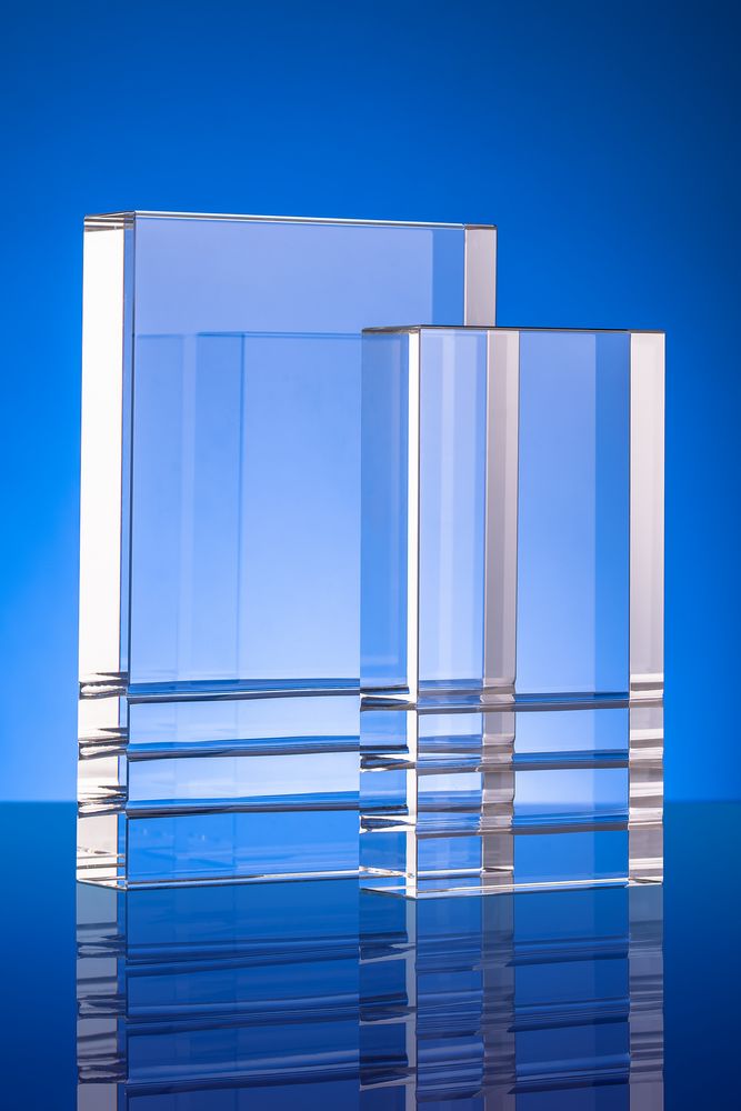 Стела изготовлена из стекла К9, в основе которого лежит оптическое боросиликатное стекло. Эту марку стекла отличает низкий процент посторонних включений, высокий показатель преломления и высокая прозрачность — идеальные качества для изготовления наград премиального уровня.