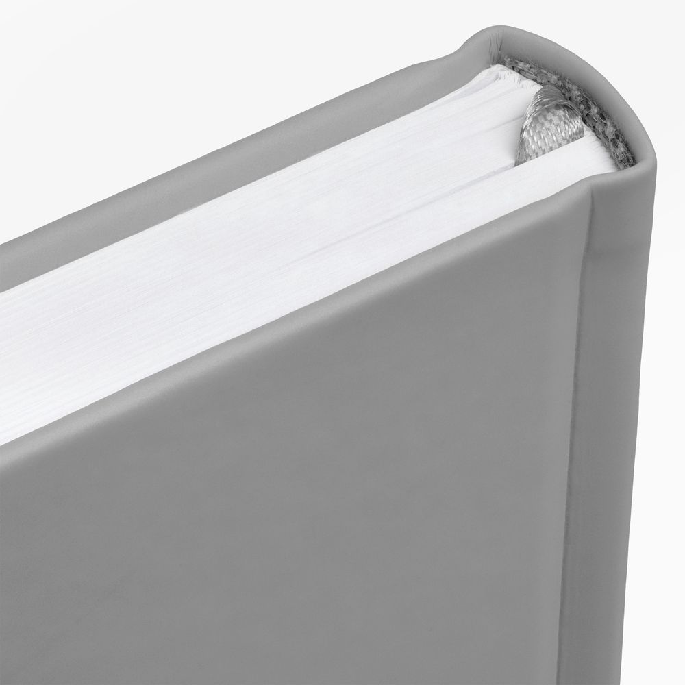 Ежедневник с твердой обложкой без поролона, выполнен из материала Soft Touch, серый СС, дополнен резинкой шириной 1 см, петлей-резинкой для ручки, капталом и ляссе серого цвета.