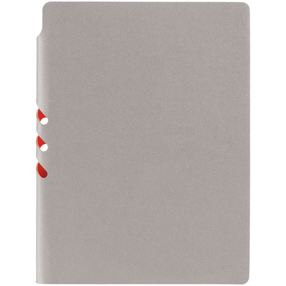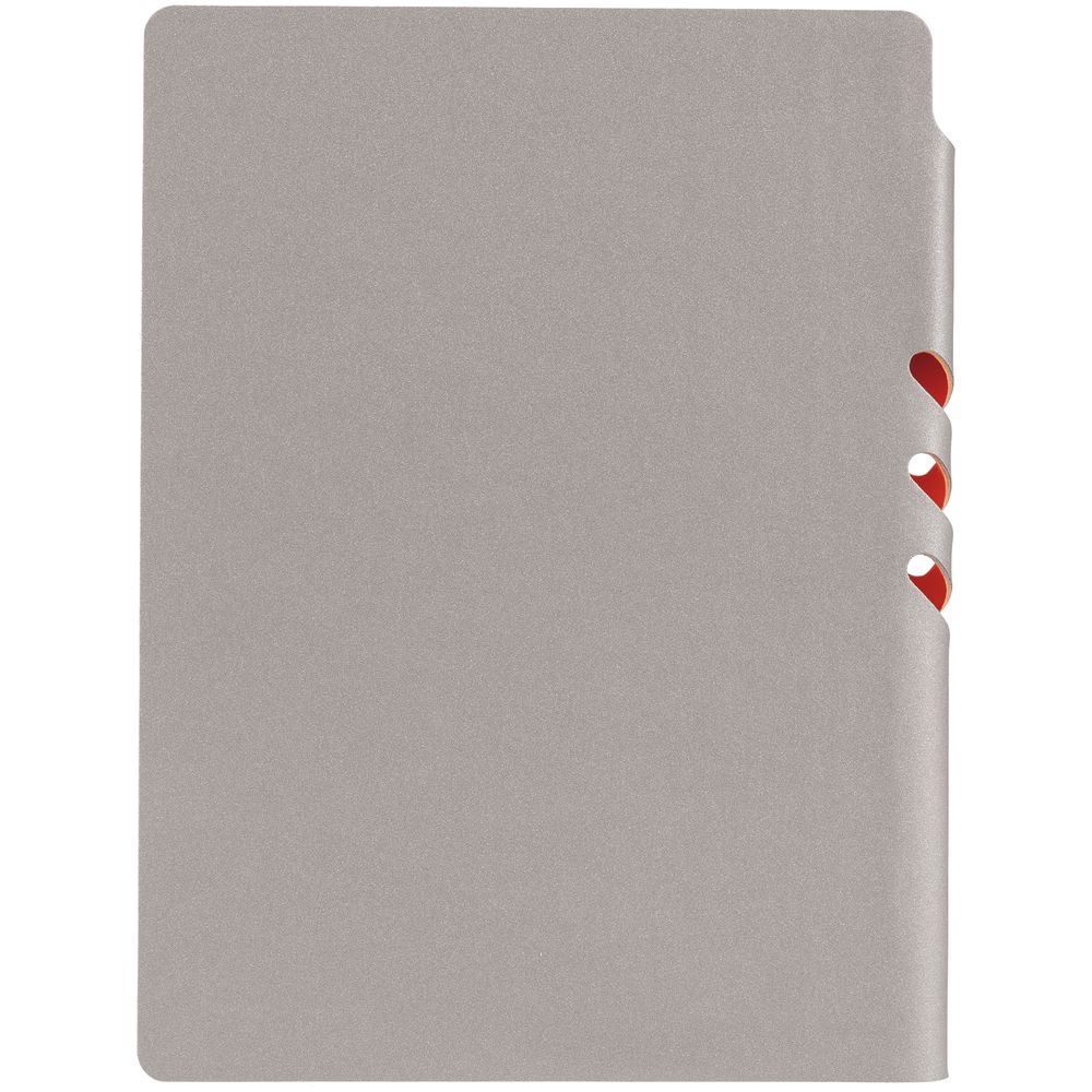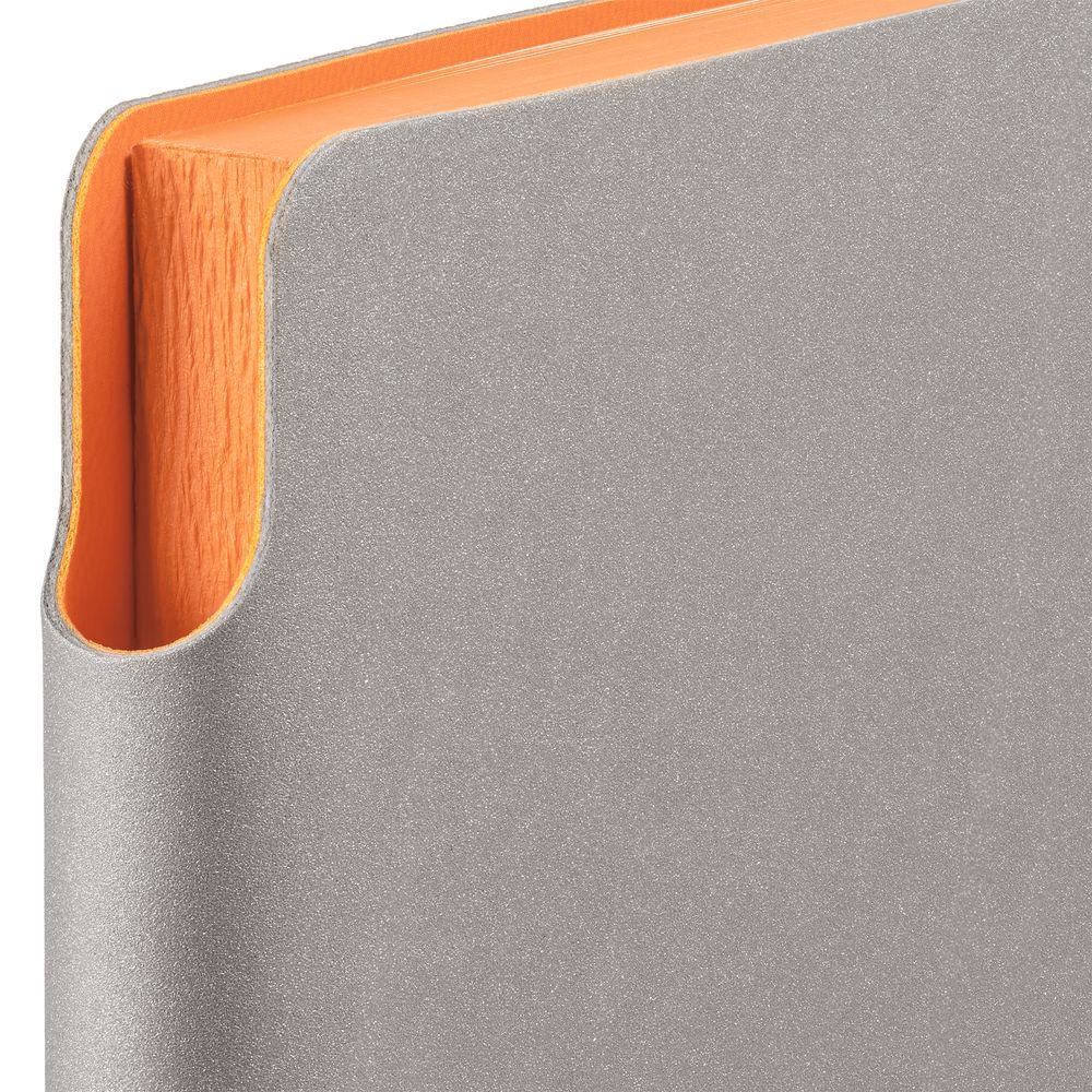 Гибкая обложка выполнена из материала Velour Melange, серый СС и Latte, оранжевый OO (внутренняя часть обложки). Внутри корешка — специальное место для крепления ручки размером до 15х0,9 см.