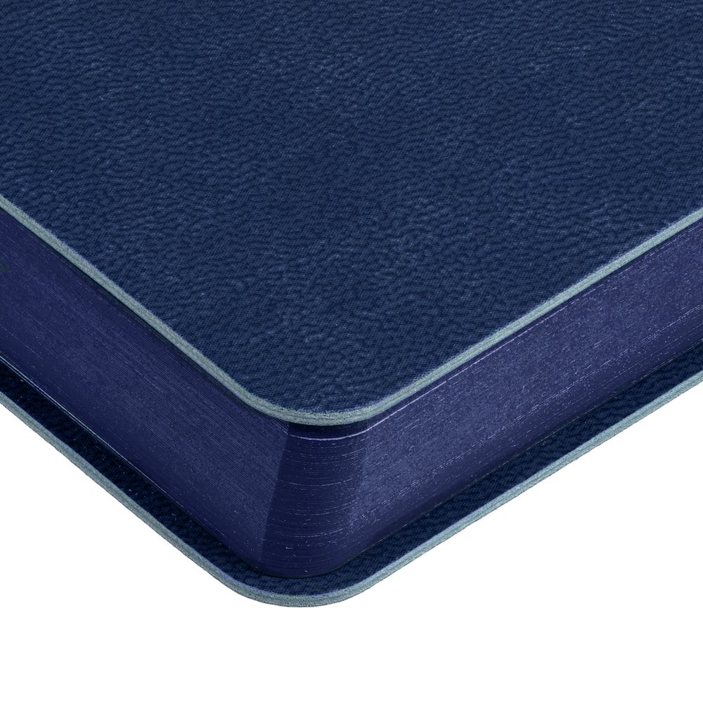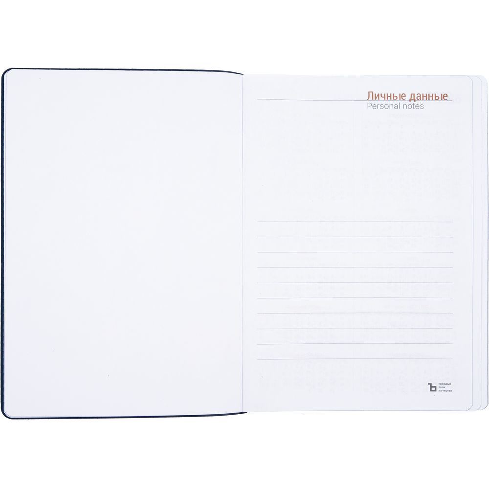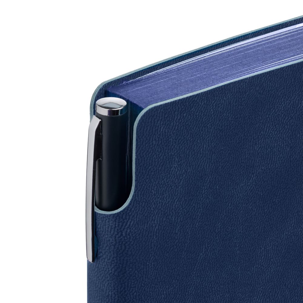 Гибкая обложка ежедневника выполнена из материала Latte, темно-синий XX. Внутри корешка — специальное место для крепления ручки размером до 15х0,9 см.