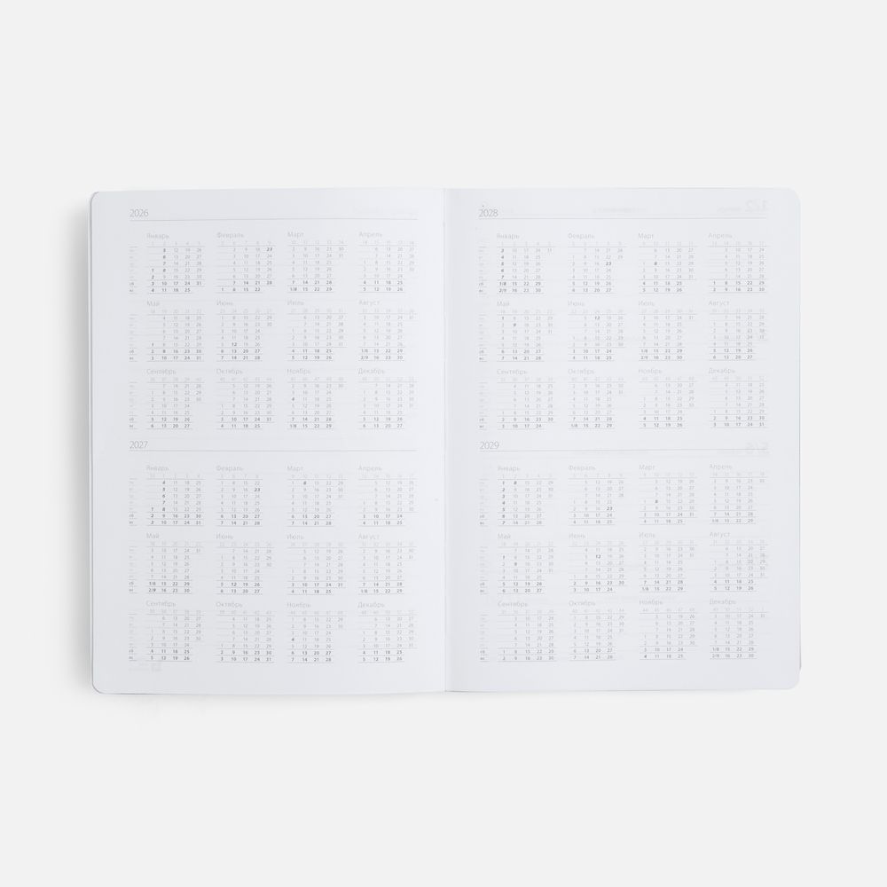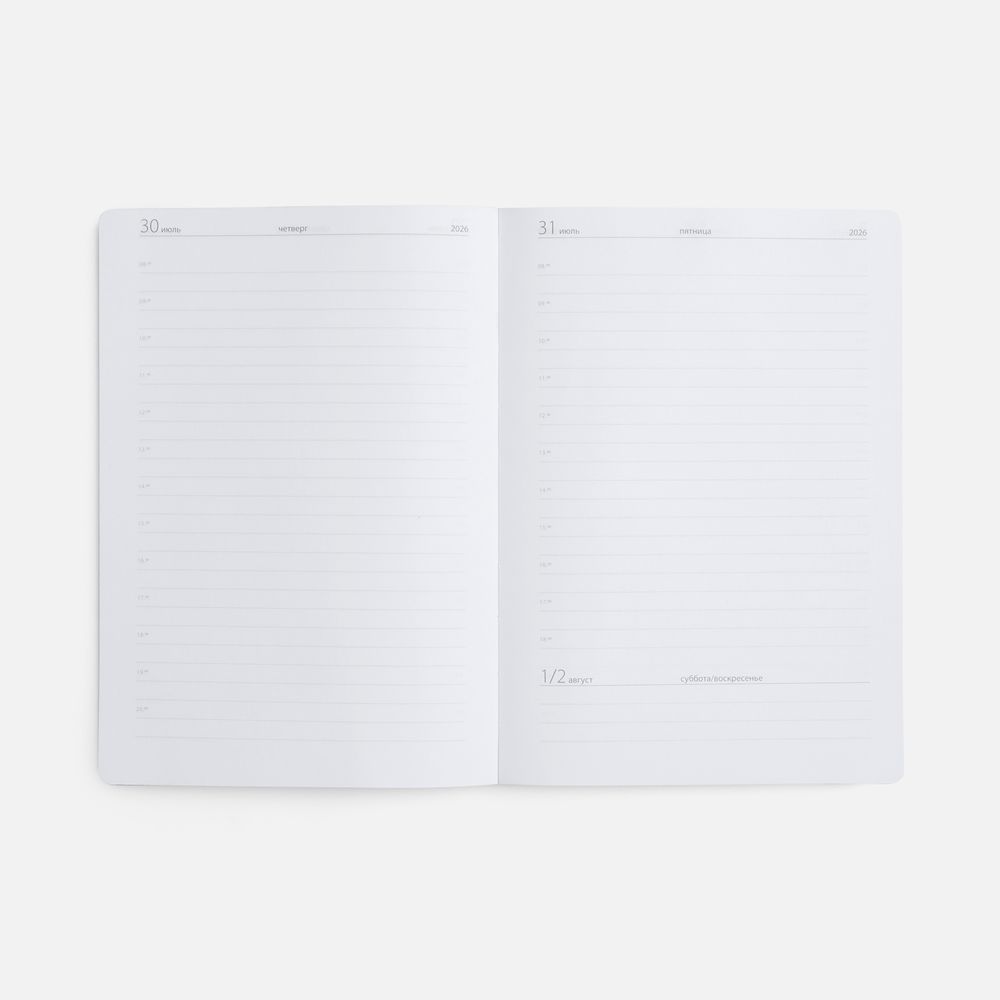 Ежедневник с полутвердой обложкой выполнен из материала Nice Touch, морская волна II, и дополнен резинкой шириной 1 см с металлическим шильдом и ляссе в цвет обложки.