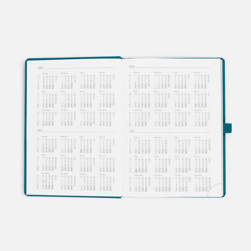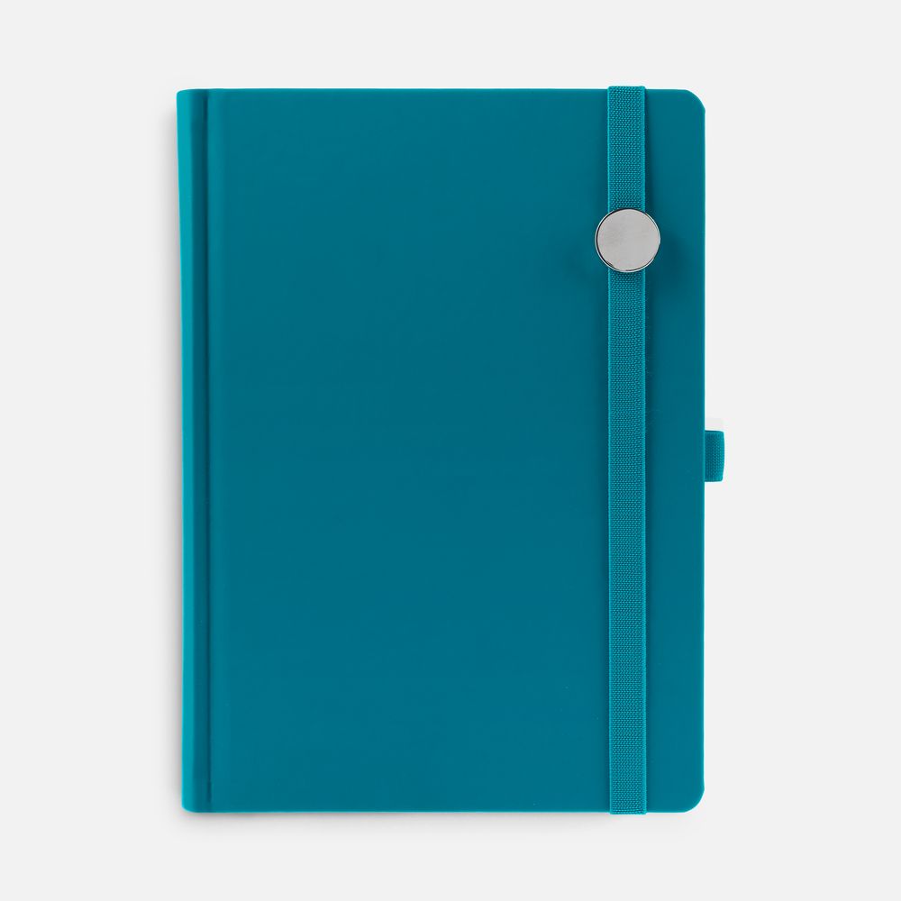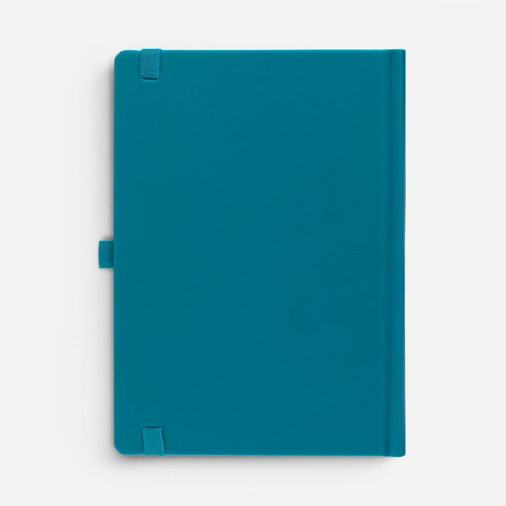 Ежедневник с твердой обложкой без поролона, выполнен из материала Soft Touch, цвет морской волны II, дополнен резинкой шириной 1 см, петлей-резинкой для ручки, капталом и ляссе темно-бирюзового цвета.