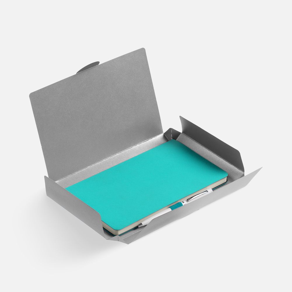Зауженный ежедневник и ручка комплементарного оттенка в простой лаконичной коробке — готовое предложение делового подарка для сотрудников и партнеров.