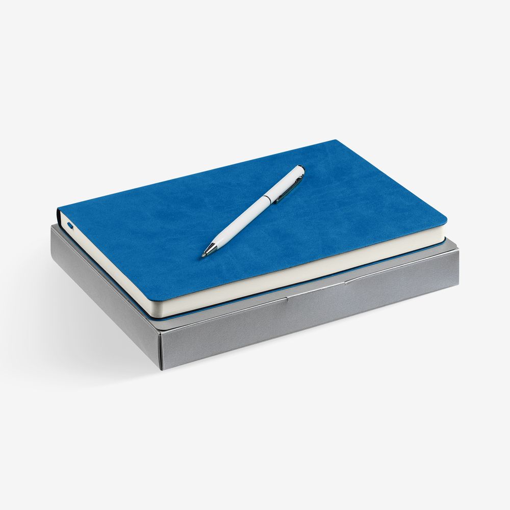 Недатированный ежедневник с гибкой обложкой из материала Latte с ляссе в цвет обложки, а также ручка в тон — в подарочной коробке из дизайнерского картона.