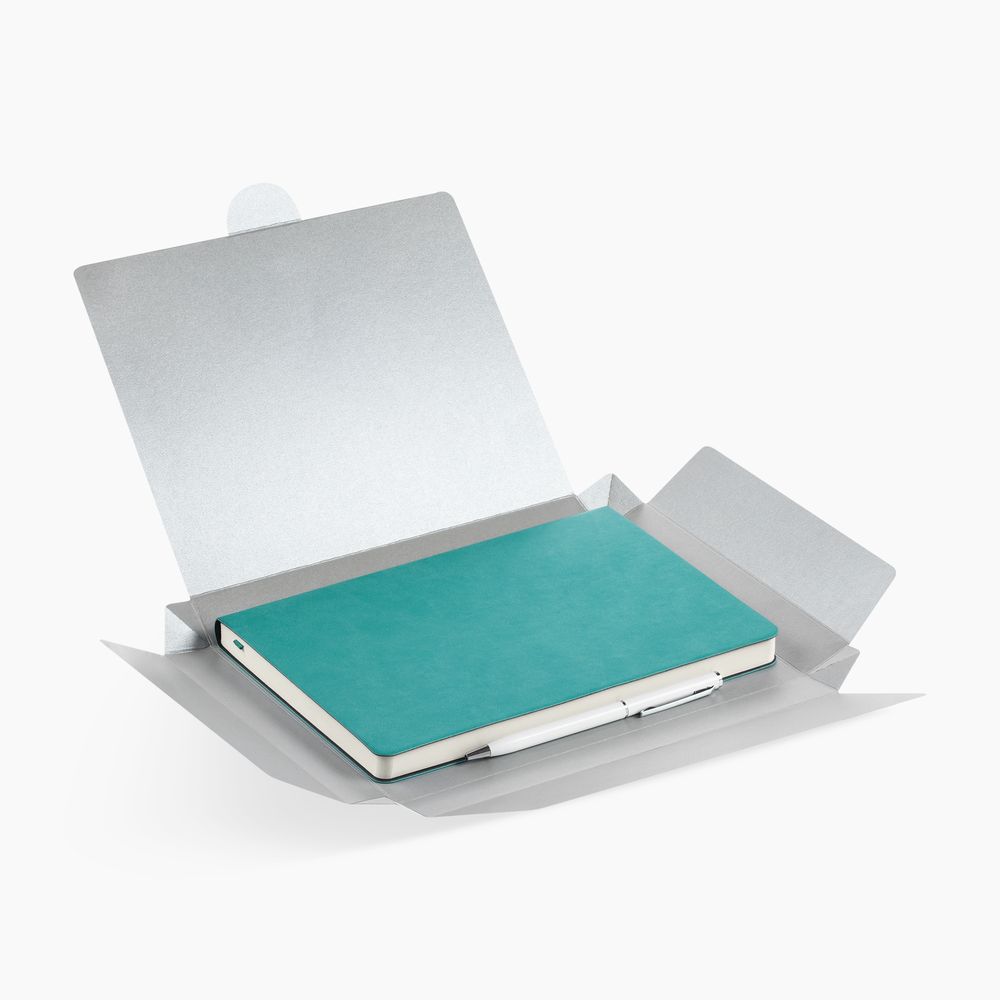 Недатированный ежедневник с гибкой обложкой из материала Latte с ляссе в цвет обложки, а также ручка в тон — в подарочной коробке из дизайнерского картона.