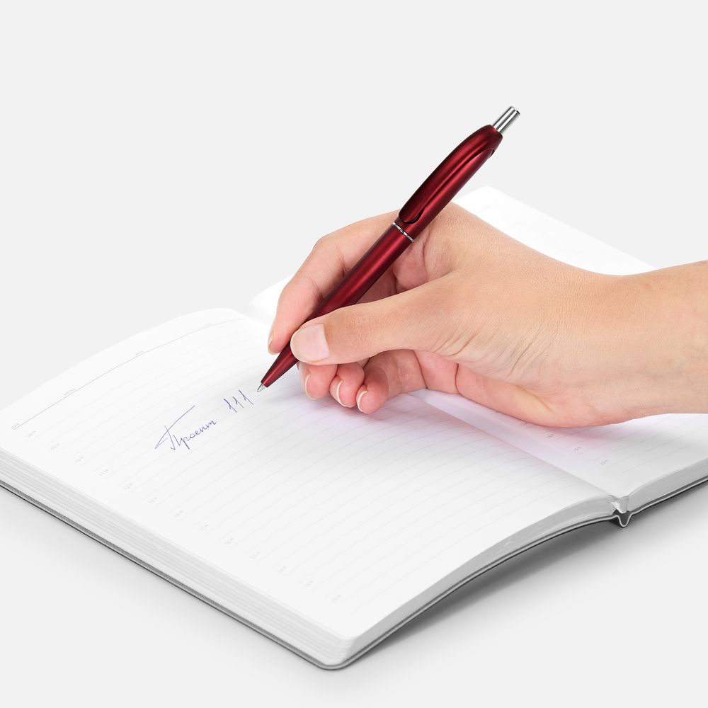 Шариковая пластиковая ручка в корпусе с эффектом «металлик» и серебристыми деталями. Приятная округлая форма клипа добавляет ручке плавности и объема.