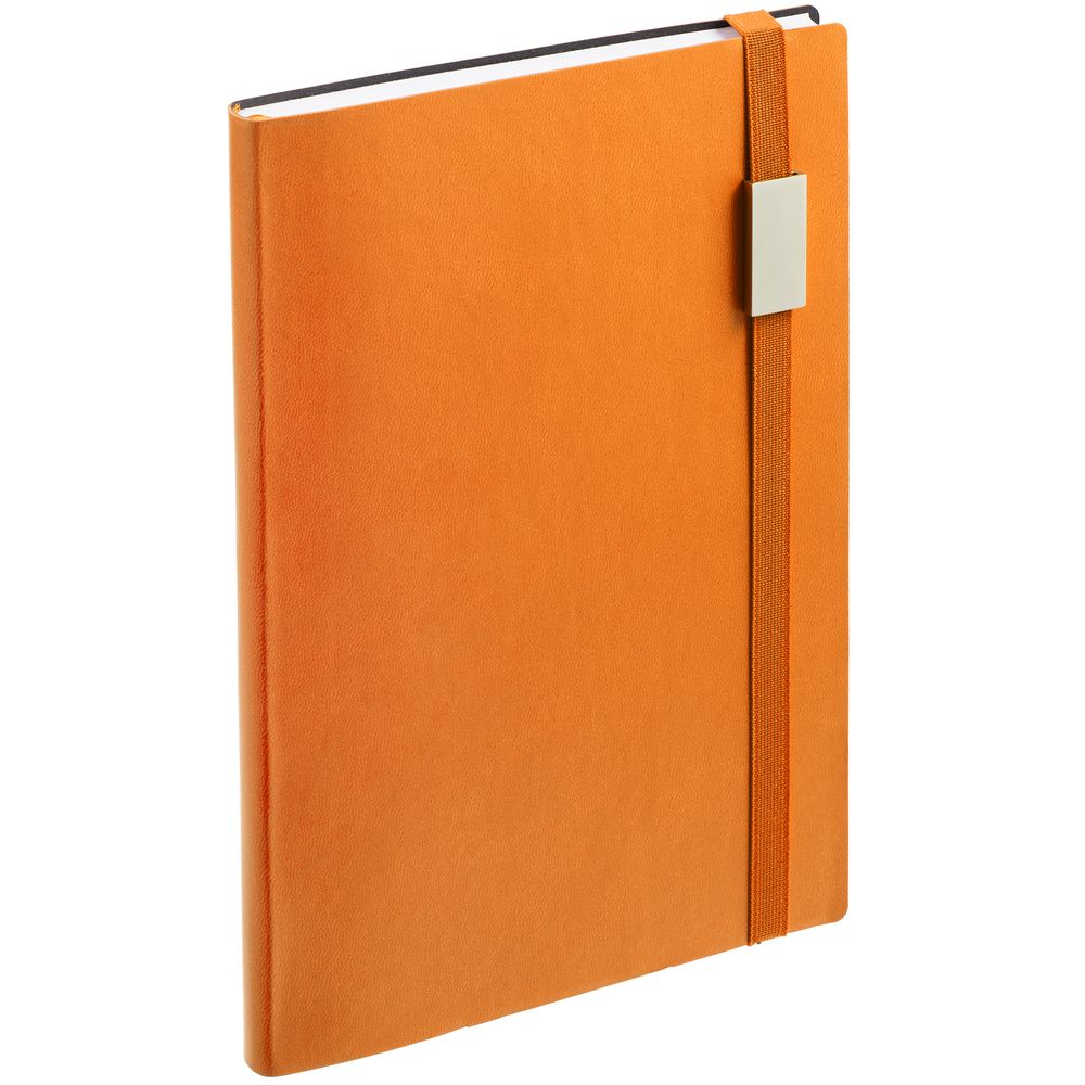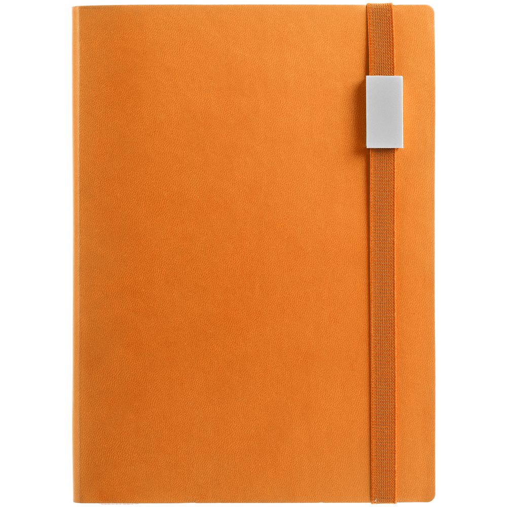 Ежедневник с гибкой обложкой, выполнен из материала Latte, оранжевый OO, дополнен резинкой шириной 1 см с металлическим шильдом, капталом и ляссе оранжевого цвета.