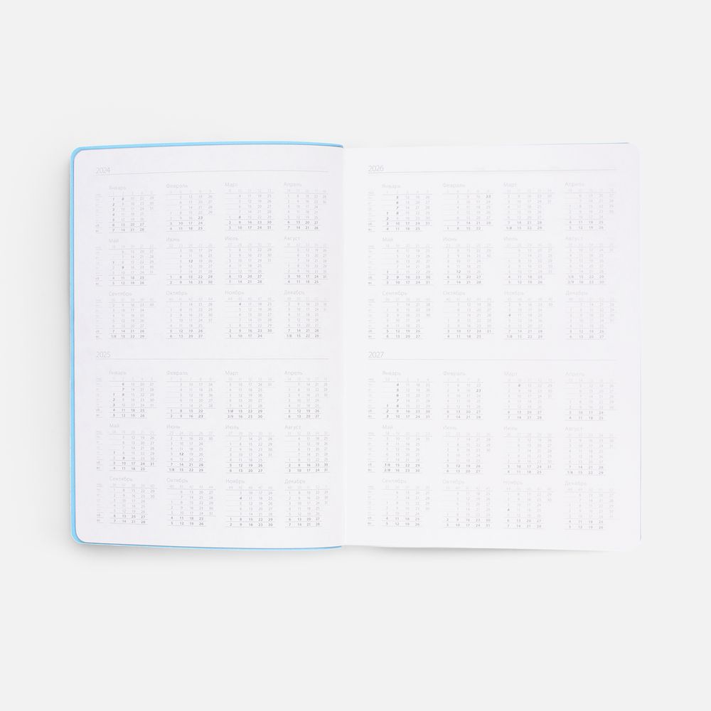 Гибкая обложка выполнена из материала Soft Touch, голубой JJ и Latte, голубой JJ (внутренняя часть обложки). Внутри корешка — специальное место для крепления ручки размером до 15х1 см.