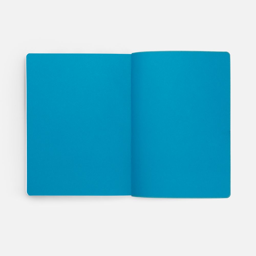 Гибкая обложка выполнена из материала Soft Touch, цвет морской волны II и Latte, цвет морской волны II (внутренняя часть обложки). Внутри корешка — специальное место для крепления ручки размером до 15х1 см.