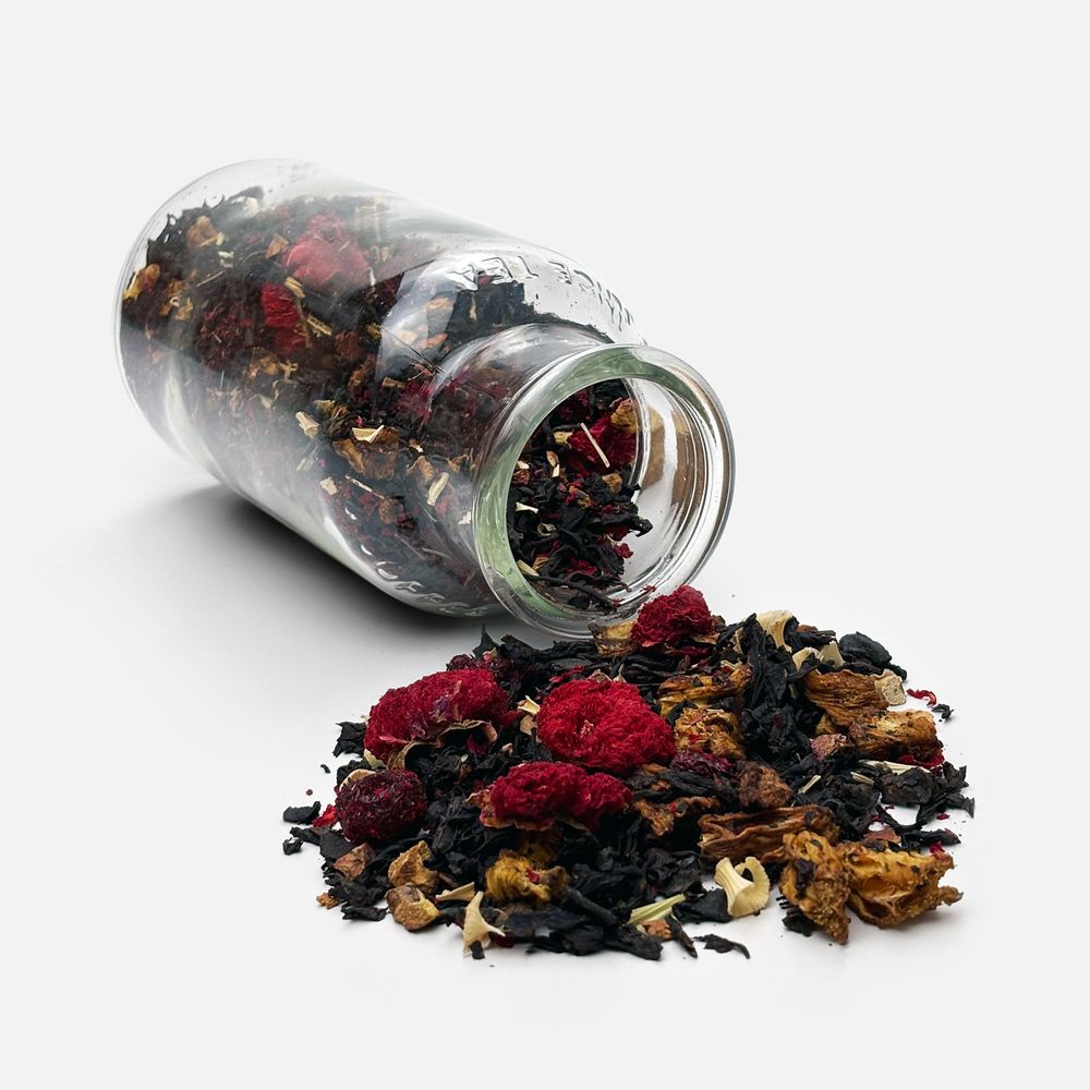 Черный крупнолистовой чай с кусочками ананаса, вишни, лемонграссом, цветками и коркой граната обладает многогранной палитрой вкуса и аромата. В состав чая входят только натуральные ингредиенты, а чайные листья предварительно вымачиваются в соке ананаса: вкус напитка становится особо насыщенным и обогащенным.
