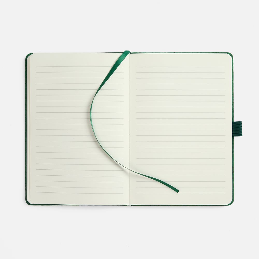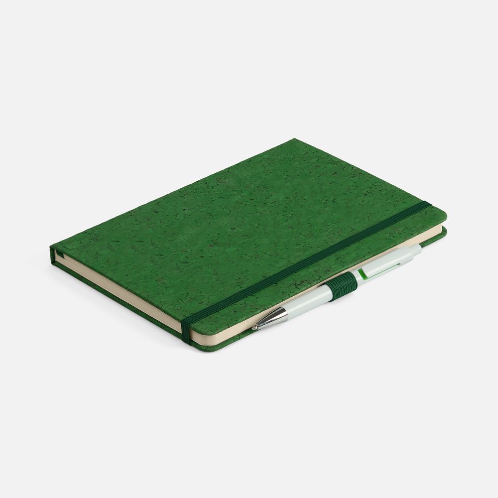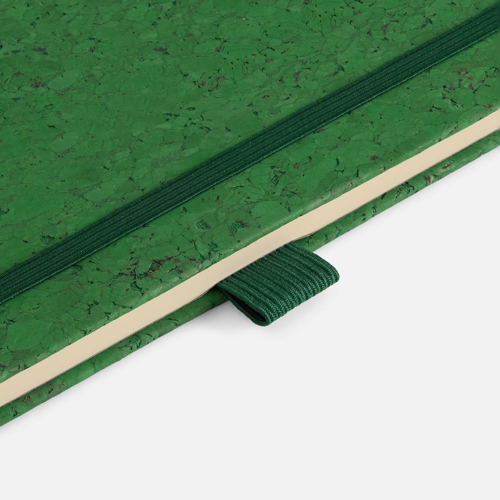 Блокнот с твердой обложкой из натуральной окрашенной пробки, дополнен петлей-резинкой для ручки, ляссе и резинкой в цвет обложки.