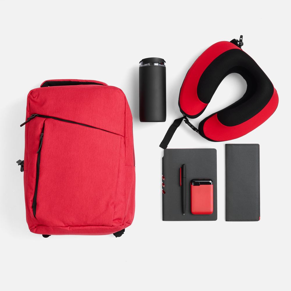 Вместительный рюкзак позволяет с легкостью захватить с собой все необходимое в дорогу. Подушка для путешествий гарантирует максимальный комфорт и поддержку шеи во время долгой поездки или перелета, а с дорожным органайзером все важные документы будут в исключительном порядке. Термостакан позволит утолить жажду или согреться, а аккумулятор обеспечит бесперебойную работу всех устройств. Войти в рабочее русло и спланировать все дела даже на ходу позволят ежедневник и ручка, которые всегда будут под рукой.