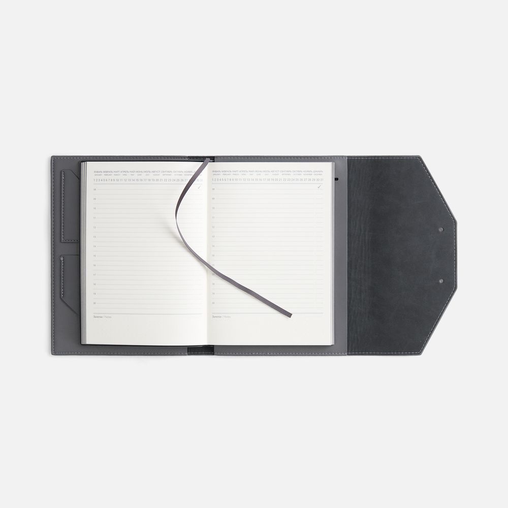 Ежедневник-органайзер в мягком переплете, формат А5+, с карманами для визиток и документов, петлей для ручки. Дополнен ляссе и капталом в цвет обложки. Клапан с прорезями застегивается на кобурные металлические кнопки.