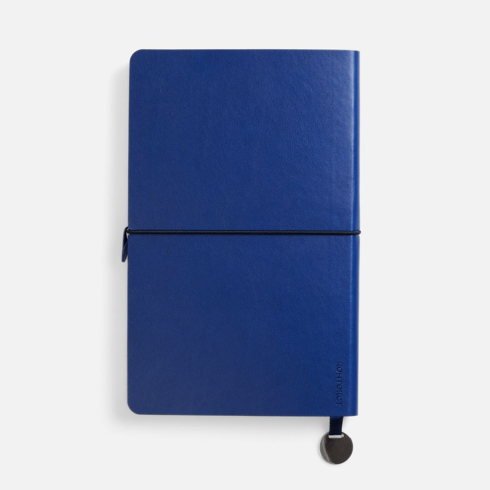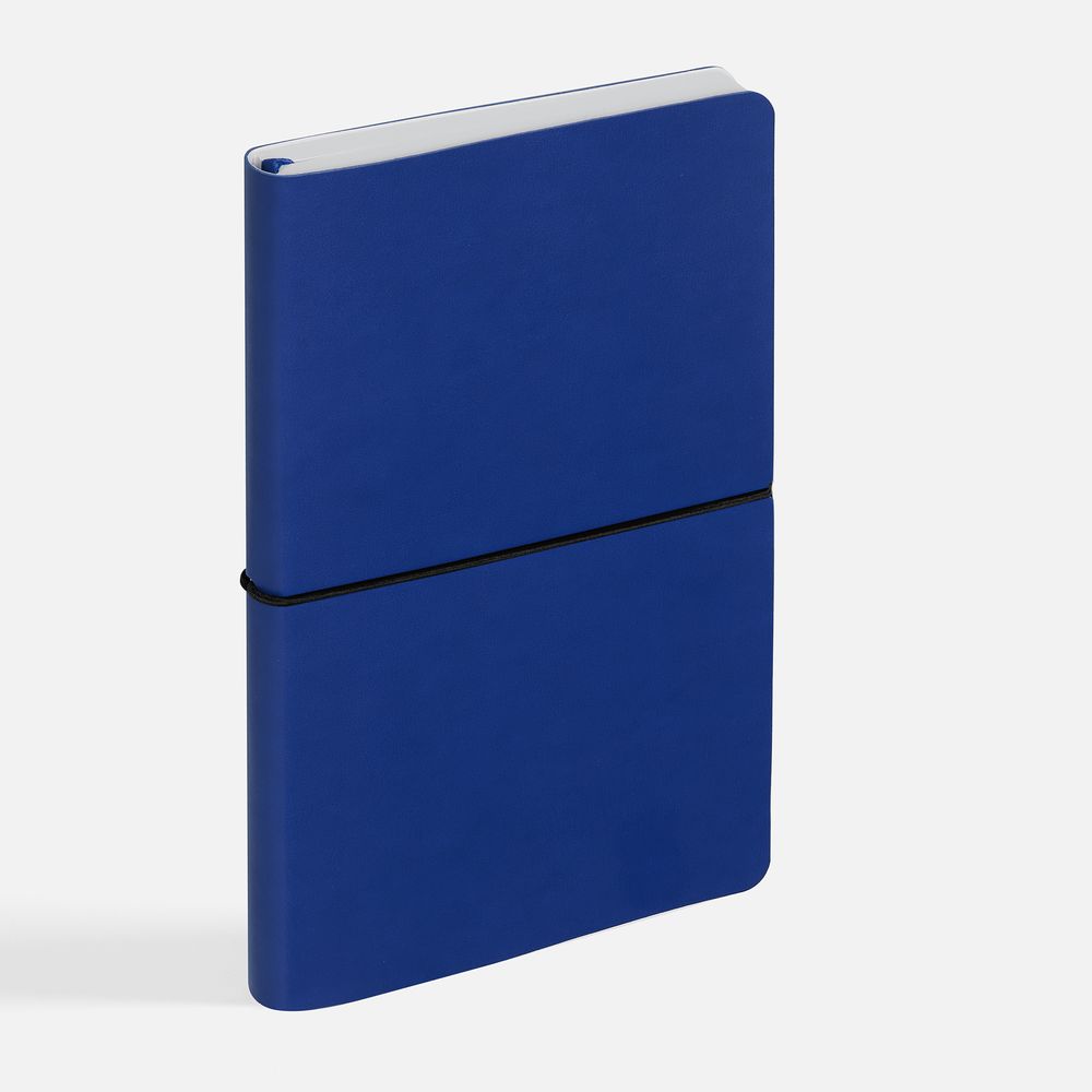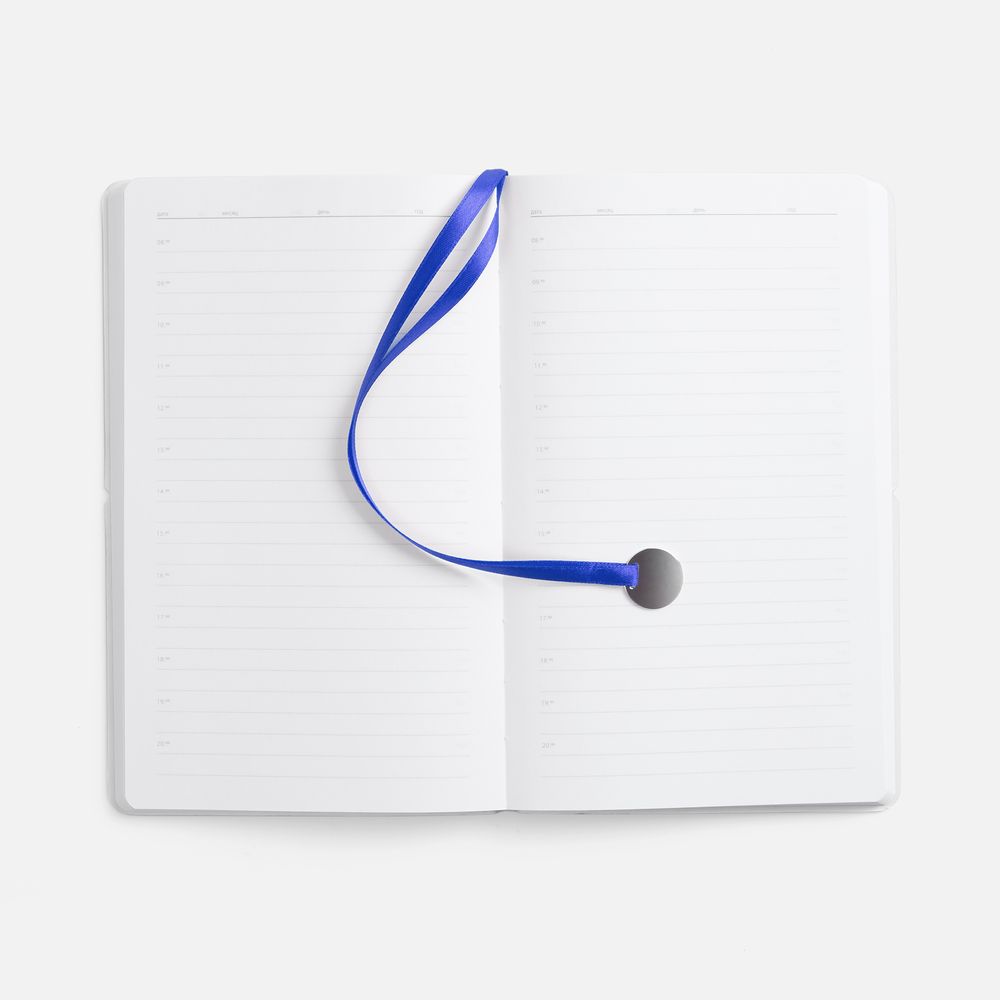 Ежедневник с гибкой обложкой, выполнен из материала Waltz, синий НН, дополнен ляссе в цвет обложки с металлическим шильдом.