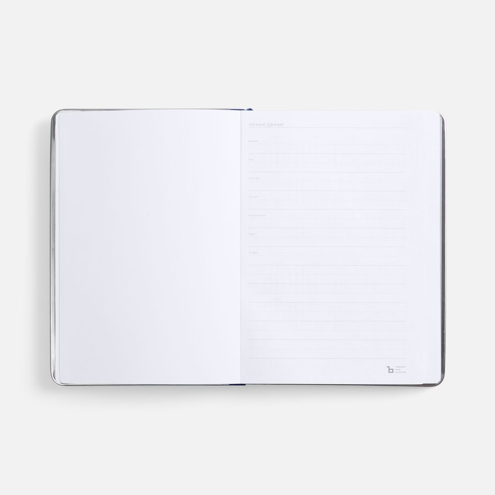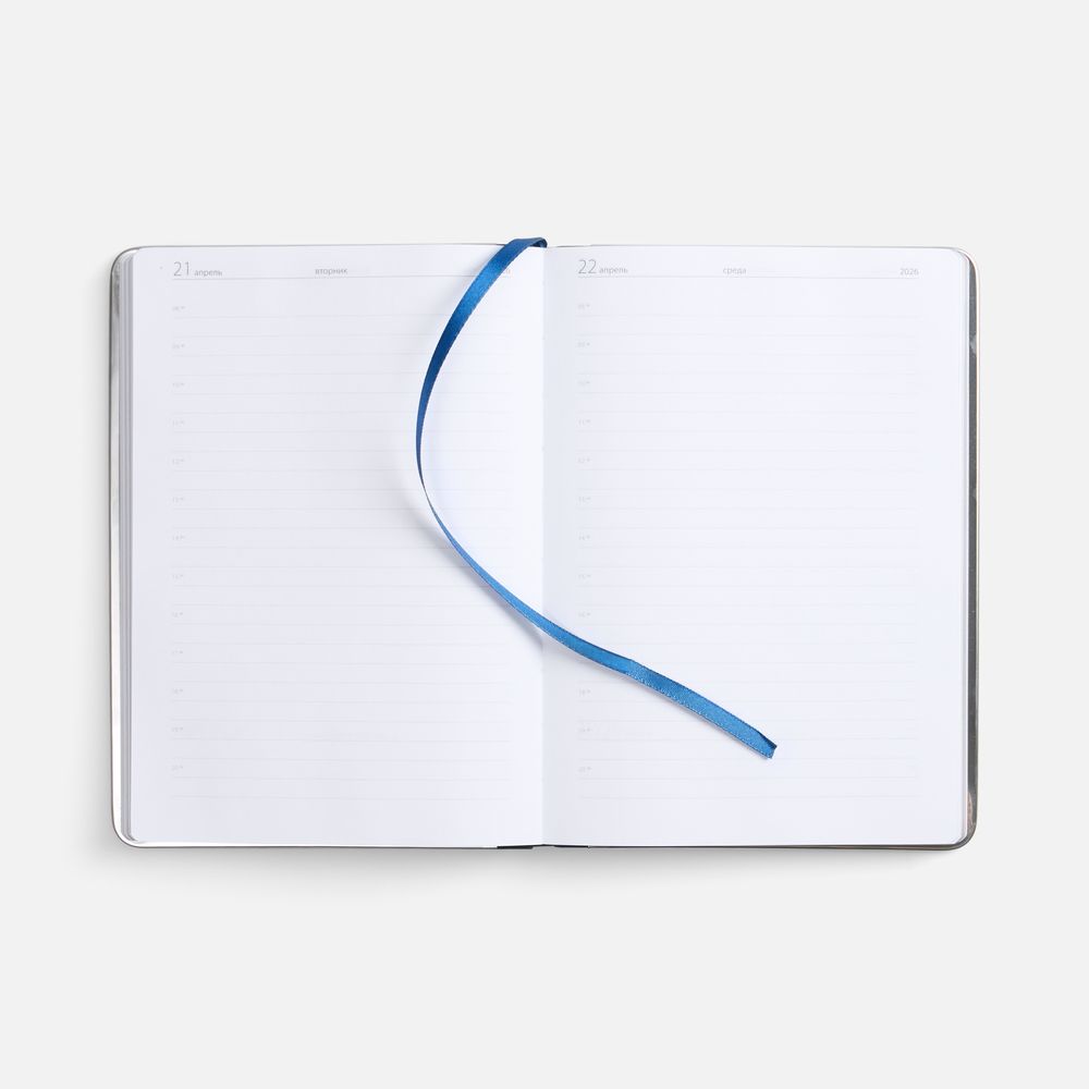 Ежедневник с твердой обложкой и серебристым обрезом блока. Выполнен из материала Nubuck, темно-синий ХХ, дополнен синим ляссе ляссе и металлическими рамками с двух сторон обложки.