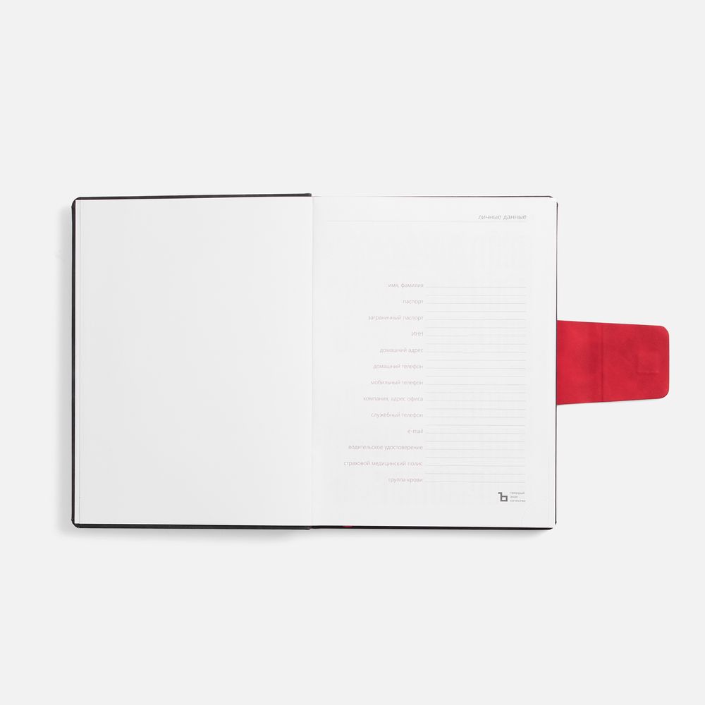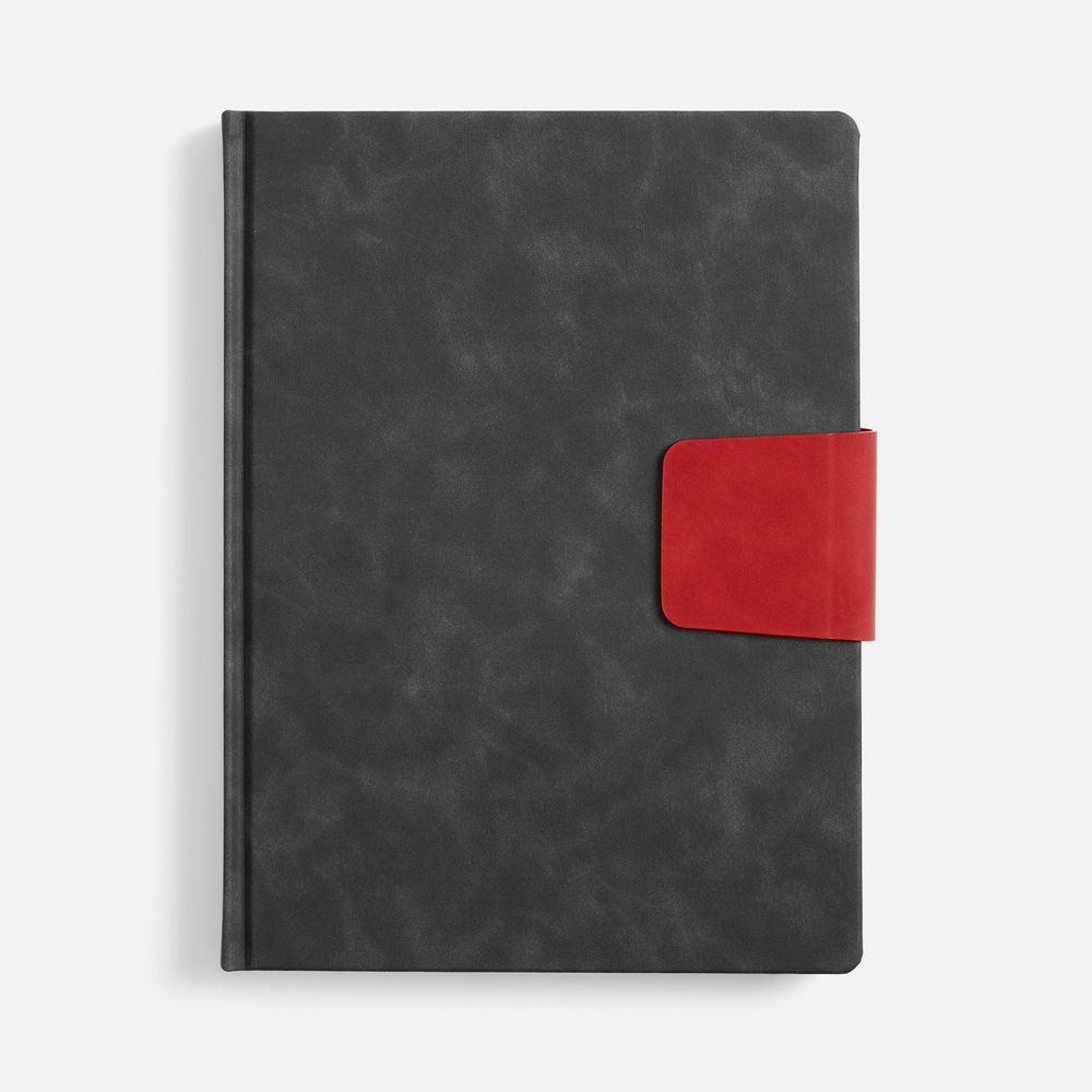 Ежедневник с твердой обложкой, выполнен из материала Nubuck Touch, черный АА, дополнен капталом, ляссе и обрезом красного цвета. Застежка — хлястик на магните из материала Nubuck Touch, красный РР.