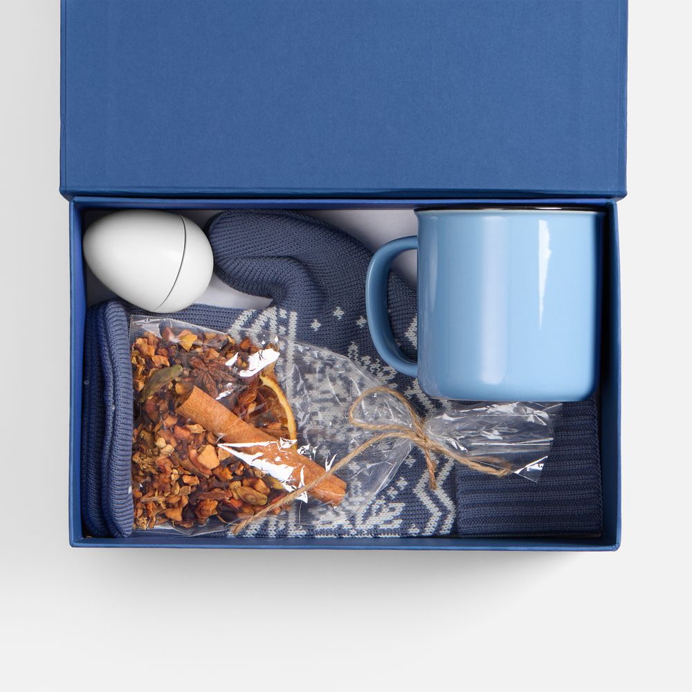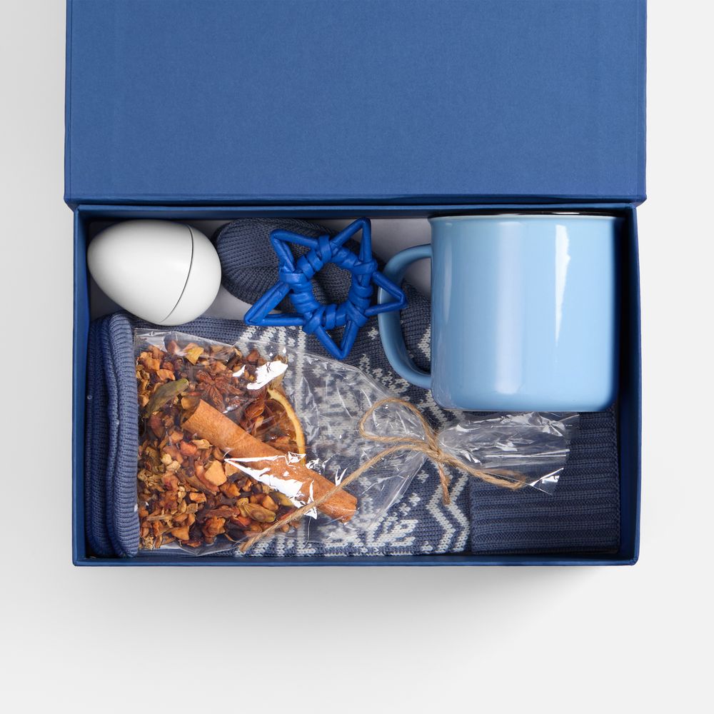 - варежки - акрил 100%; футляр для бальзама - пластик; кружка - фаянс; плетеная фигурка - бумага; коробка - переплетный картон, бумага Malmero «Скандинавский синий»