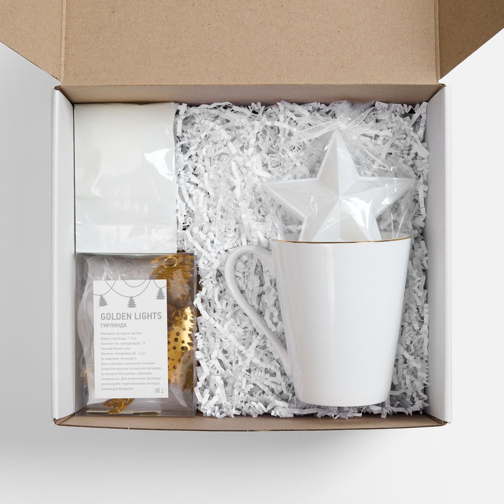 - кружка - костяной фарфор; гирлянда - пластик, металл; свеча - парафин; ежедневник - искусственная кожа; ручка - металл
