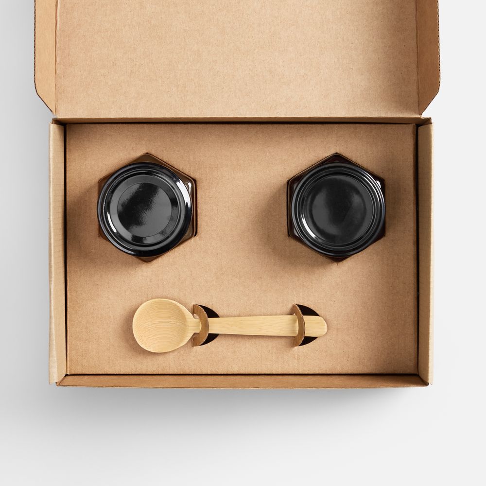 - коробка - микрогофрокартон; баночки - стекло, жесть; ложка - бамбук