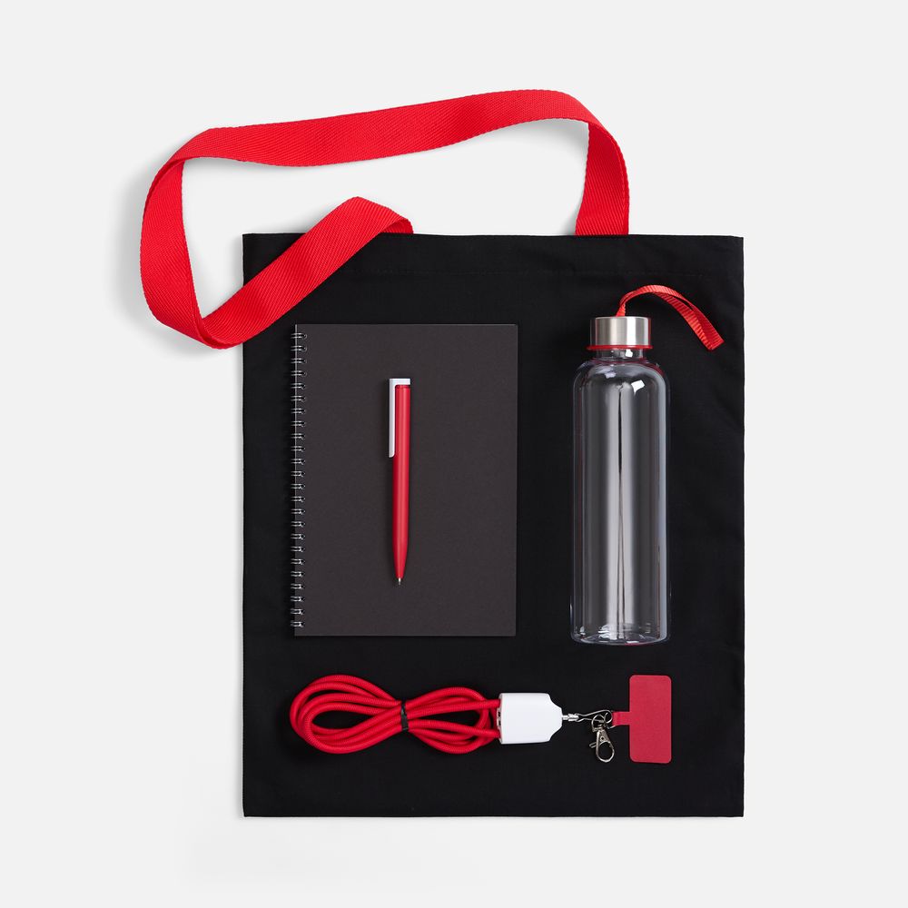 сумка - хлопок, 240 г/м²; ручки - полиэстер; кабель-ланьярд - нейлон, пластик; металл; бутылка - пластик, пищевой; крышка - металл, пластик; блокнот - бумага, картон; ручка - пластик