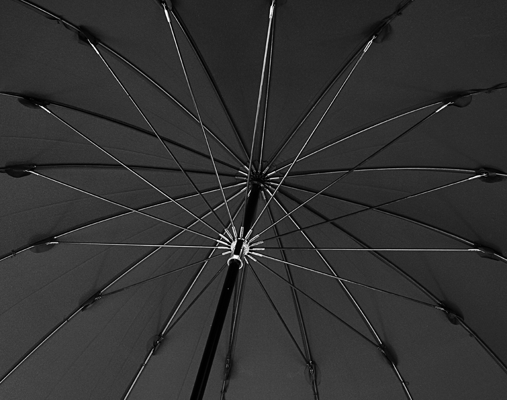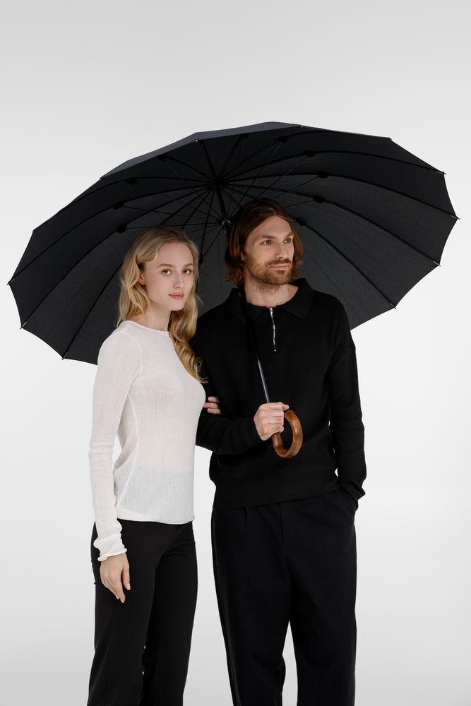 Солидный изысканный зонт с ручкой из дерева и 16 спицами. Большой купол легко укроет от дождя сразу двоих, а надежная конструкция выдержит даже сильный ветер.