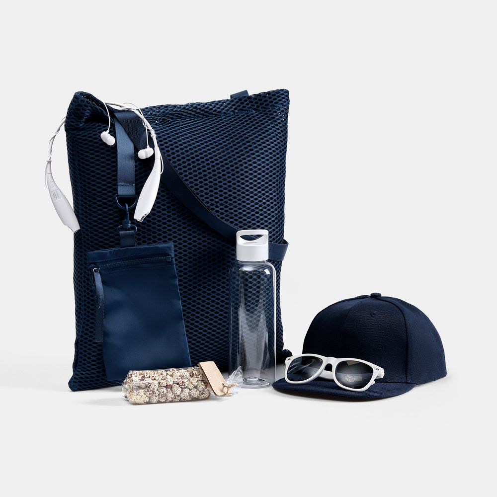 - шопер - полиэстер, твил 290D с полиуретановой пропиткой; трехслойная сетка; наушники, очки - пластик; бейсболка - полиэстер 100%, плотность 300 г/м²; бутылка - пластик, ПЭТ
