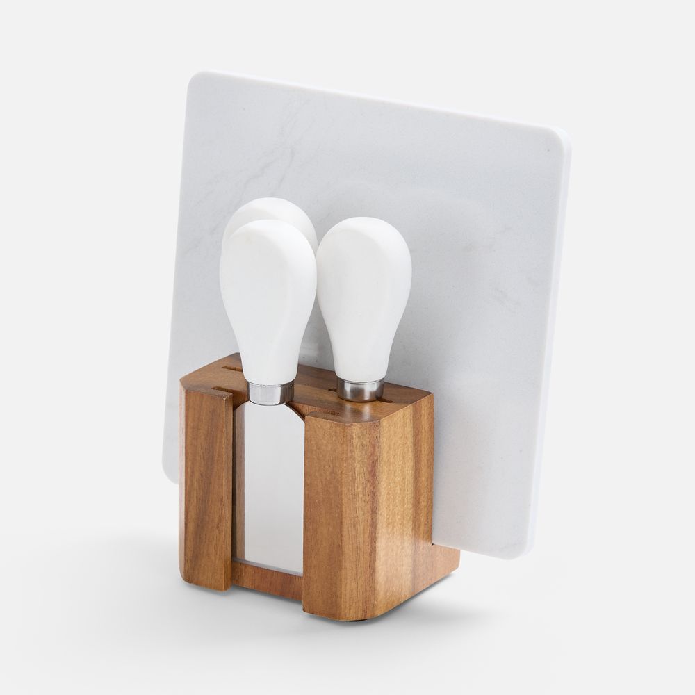 - доска, рукоятка ножей - мрамор, искусственный; подставка - дерево, акация; лезвия у ножей - нержавеющая сталь, CR13