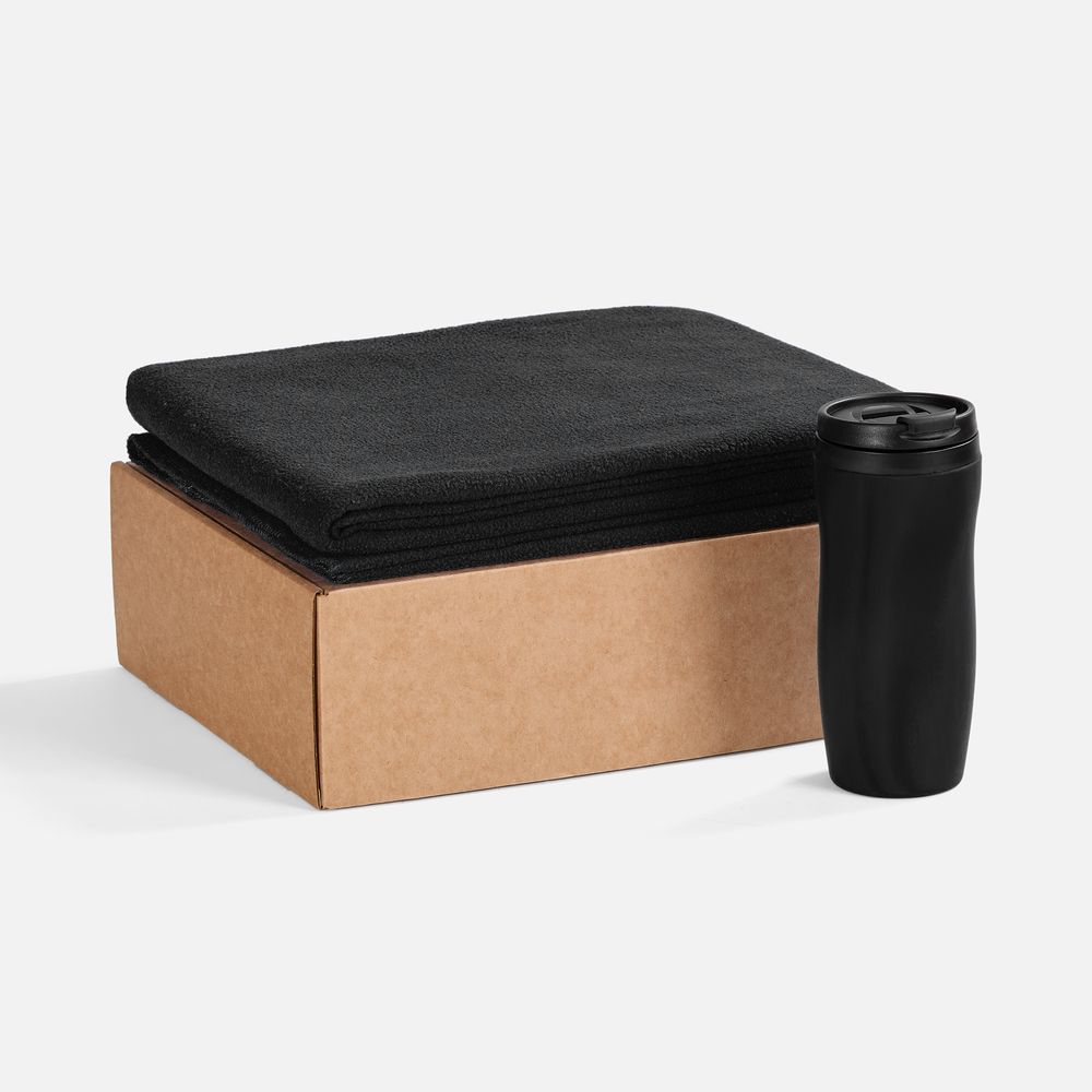 - термостакан - пластик, крышка, внутренняя колба; нержавеющая сталь, корпус; покрытие софт-тач; плед - флис, плотность 180 г/м²; коробка - переплетный картон; наполнитель - бумага
