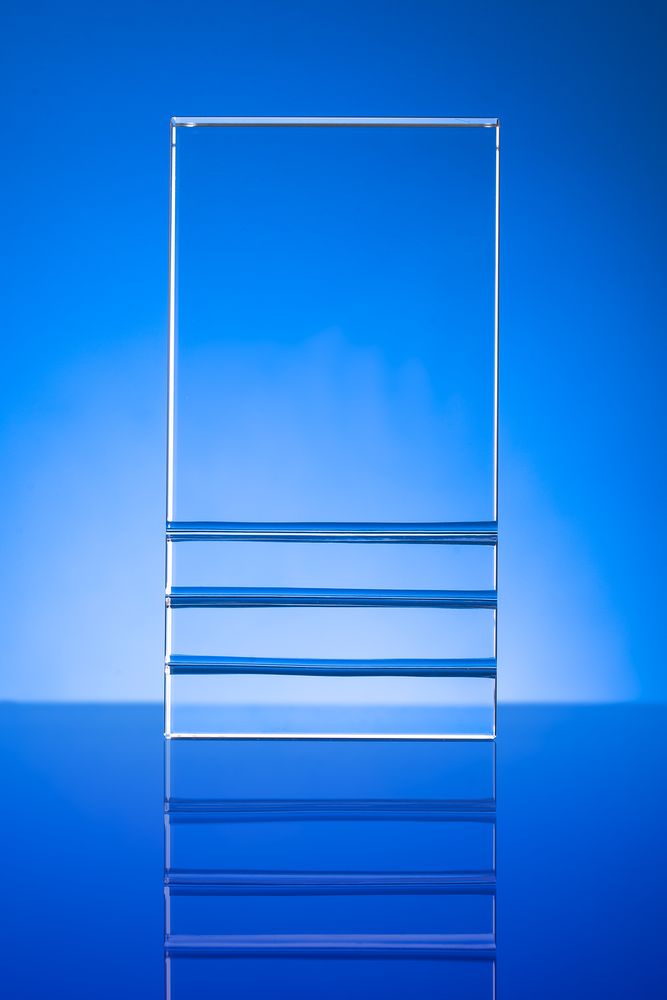 Стела изготовлена из стекла К9, в основе которого лежит оптическое боросиликатное стекло. Эту марку стекла отличает низкий процент посторонних включений, высокий показатель преломления и высокая прозрачность — идеальные качества для изготовления наград премиального уровня.