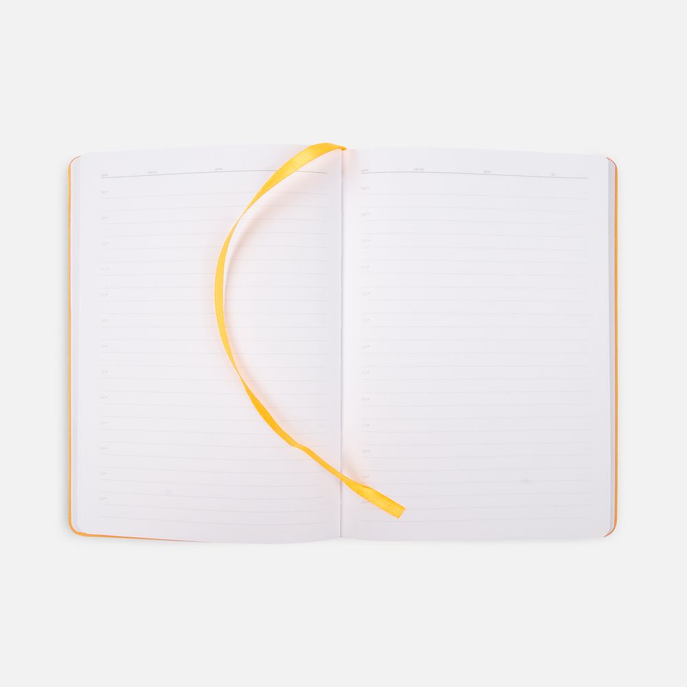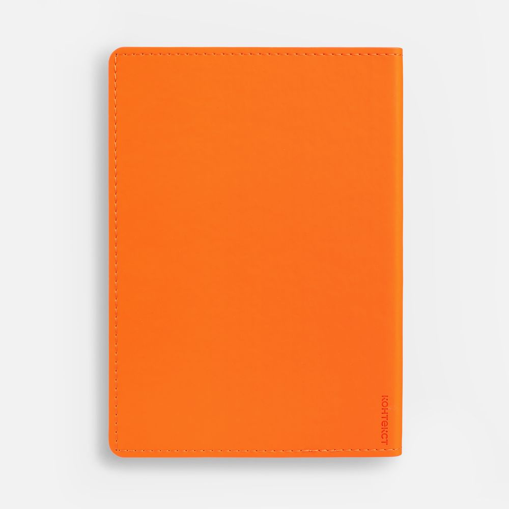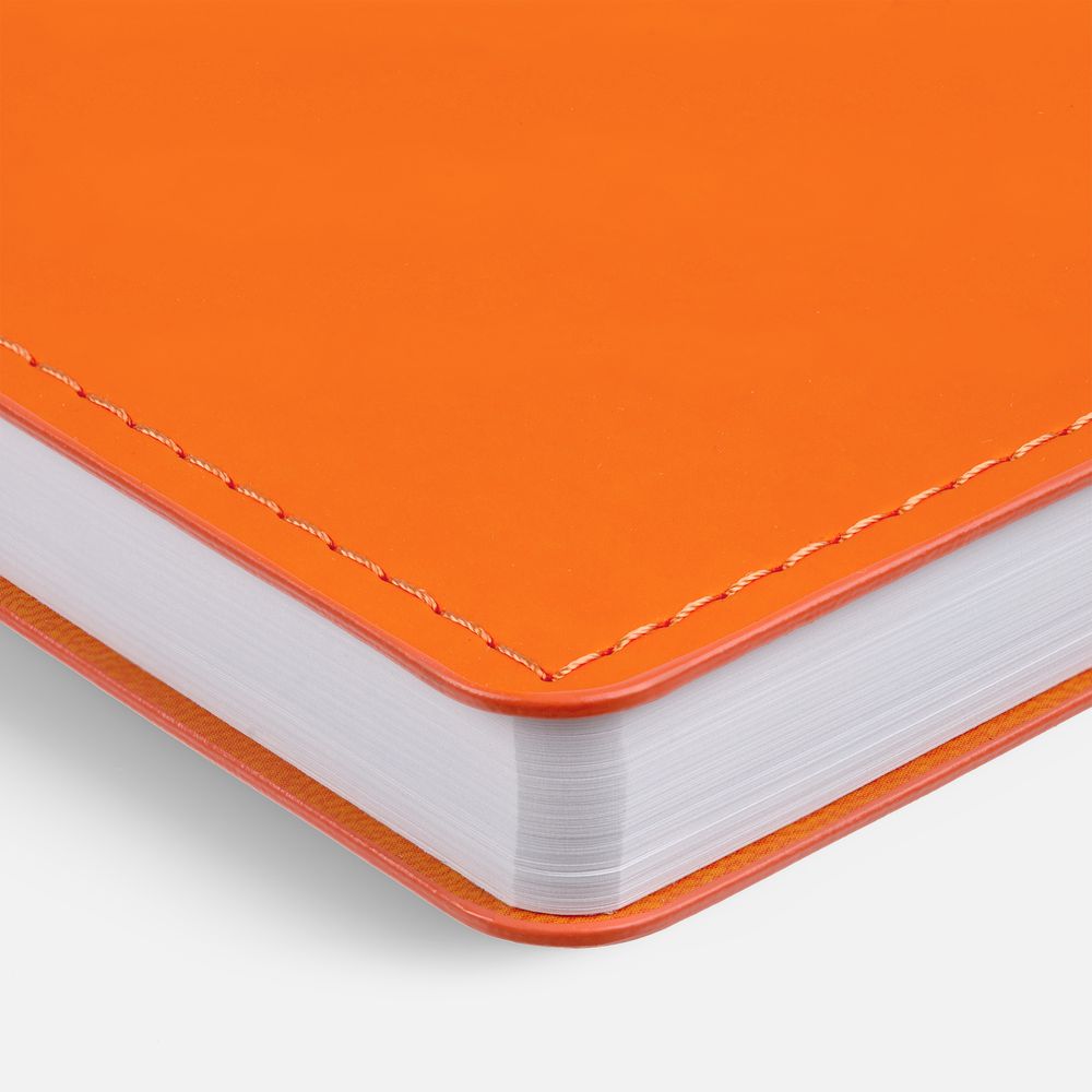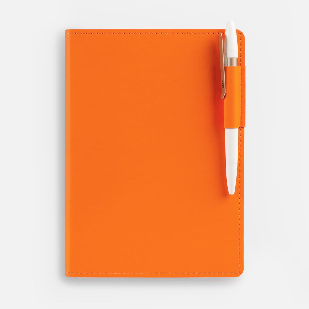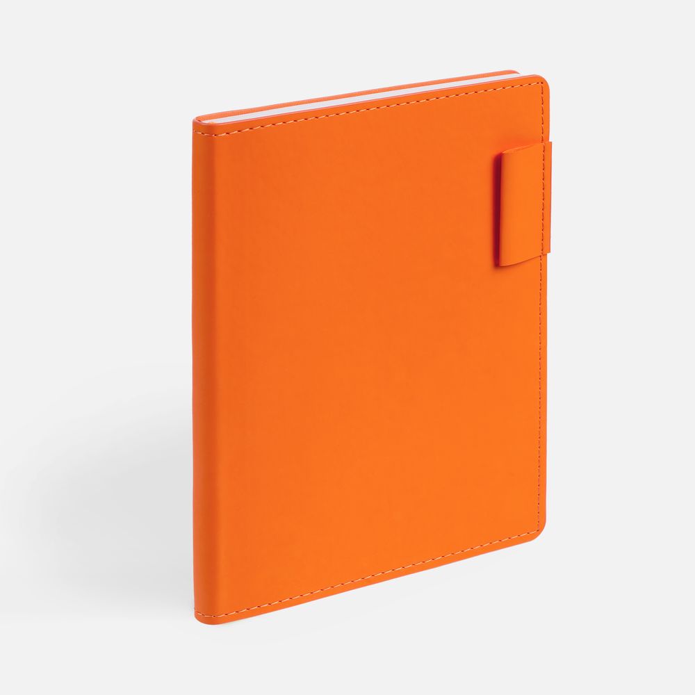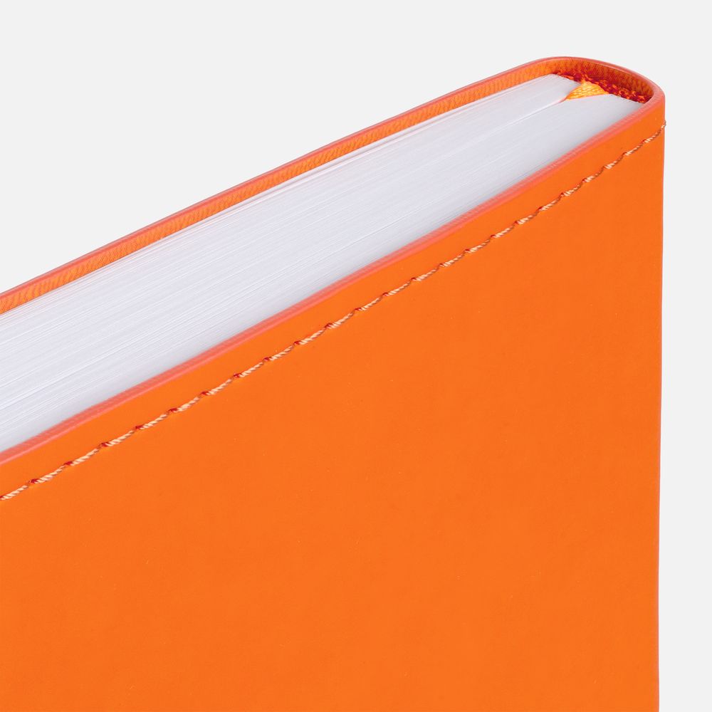 Ежедневник с гибкой обложкой из материала Soft Touch, оранжевый ОО и Latte, оранжевый ОО (внутренний материал),  дополнен петелькой для ручки из покровного материала, капталом, ляссе и закрашенным срезом обложки в цвет материала.