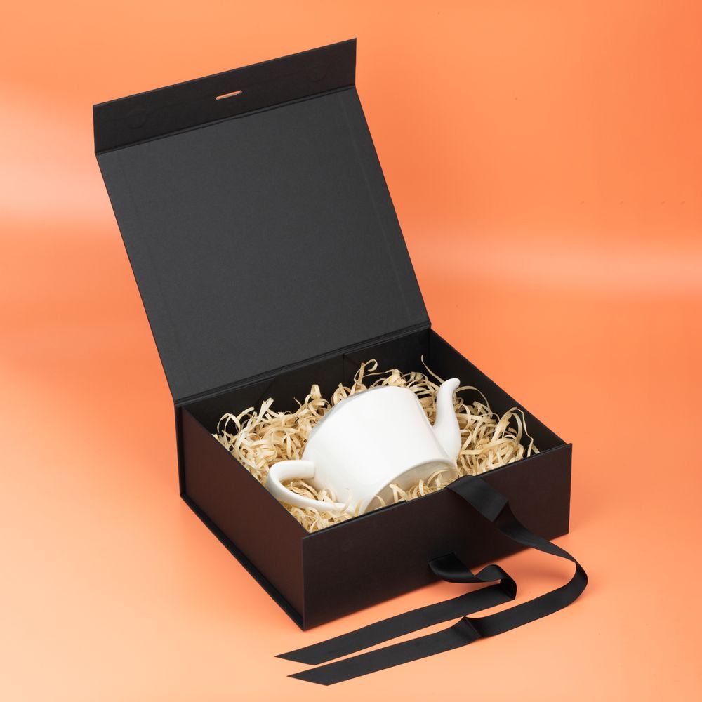 Коробка из переплетного картона, кашированного тонированной в массе крафтовой бумагой. Крышка на двух магнитах дополнительно фиксируется репсовой лентой.Толщина картона 2 мм.