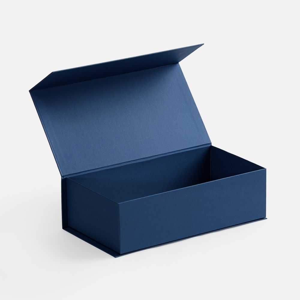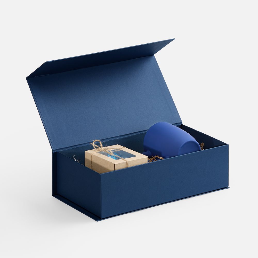 Коробка изготовлена из переплетного картона, кашированного гладкой дизайнерской бумагой Malmero «Благородный синий», с крышкой на магните.