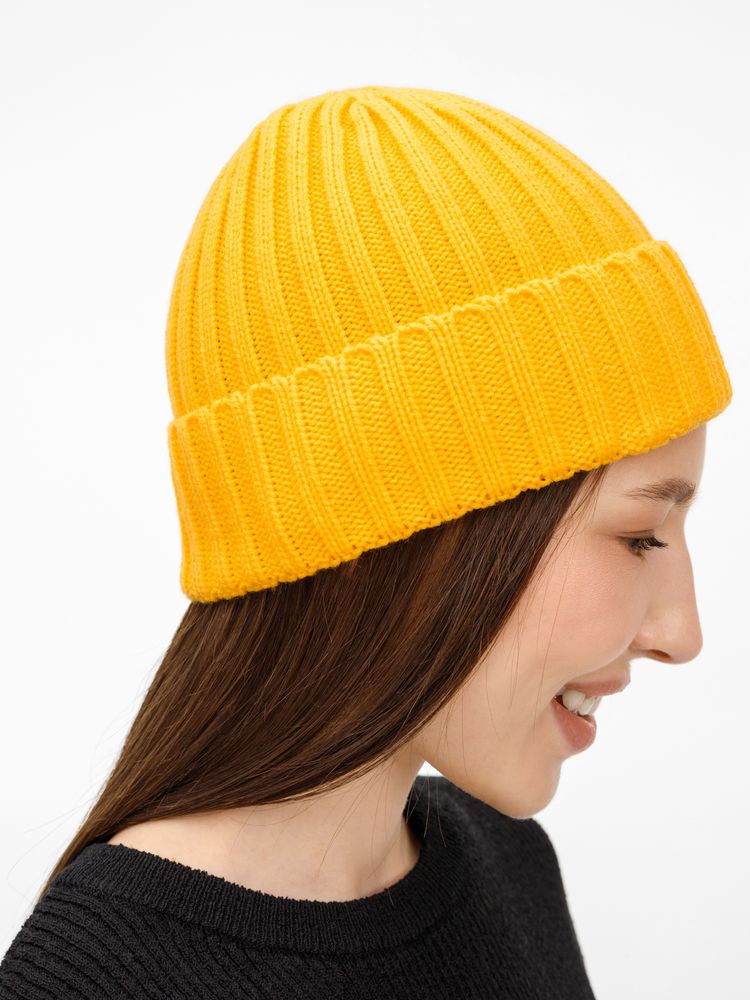 Однослойная шапка рельефной вязки с отворотом.
