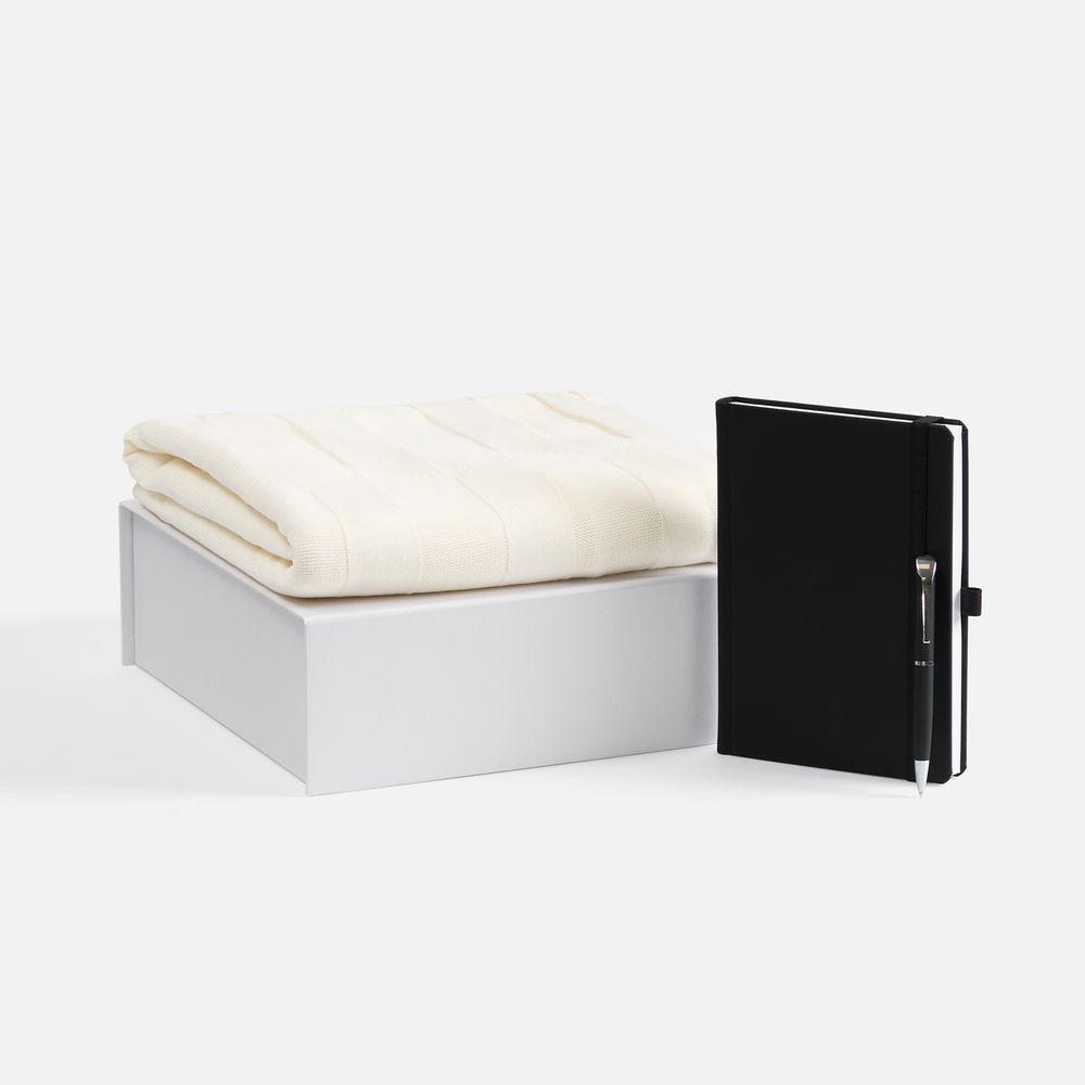 Однотонный набор с основной канцелярией и пледом — классика жанра в уютном исполнении. С компактным ежедневником будет удобно делать заметки  в любое время — благодаря петельке для ручки любимый пишущий инструмент будет всегда под рукой. А изысканный акриловый плед с геометрическим узором позволит выразить самые теплые пожелания и ддобавит плавных линий в интерьер.