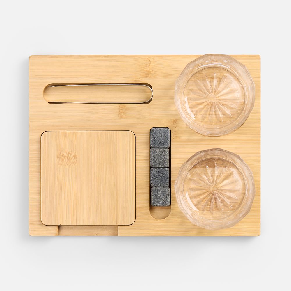 Полный арсенал для дегустации любимых сортов включает два элегантных стакана, костеры и доску из натурального бамбука для безупречной подачи, камни для охлаждения без потери глубины вкуса и удобные щипцы для их использования.