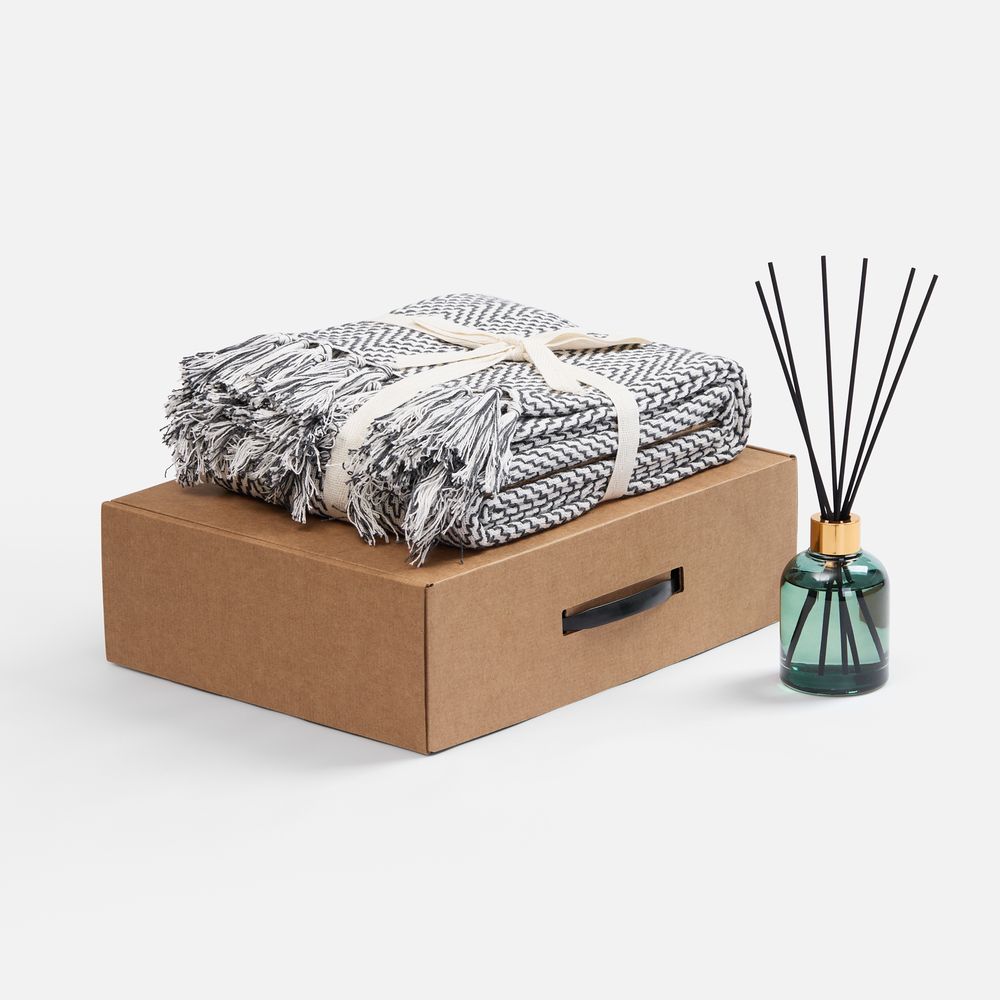 - плед - хлопок 80%, полиэстер 20%, плотность 260 г/м²; флакон - стекло, палочки из файбера; коробка - микрогофрокартон