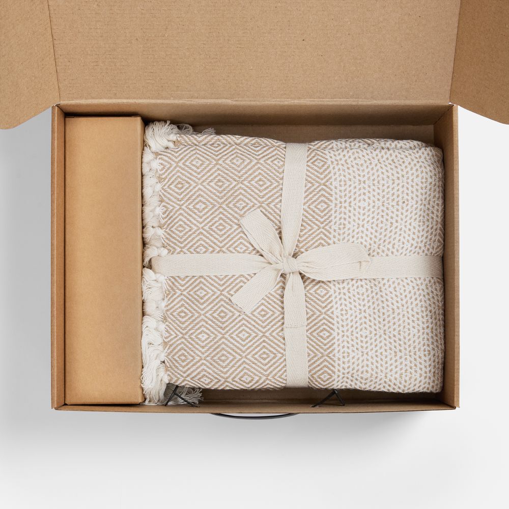 плед - хлопок 80%, полиэстер 20%, плотность 260 г/м²; флакон - стекло, палочки - дерево; коробка - микрогофрокартон