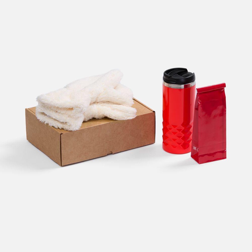 - термостакан, крышка - пластик; внутренняя стенка - нержавеющая сталь; варежки - полиэстер 100%, плотность 280 г/м², длинноворсовый флис; коробка - микрогофрокартон