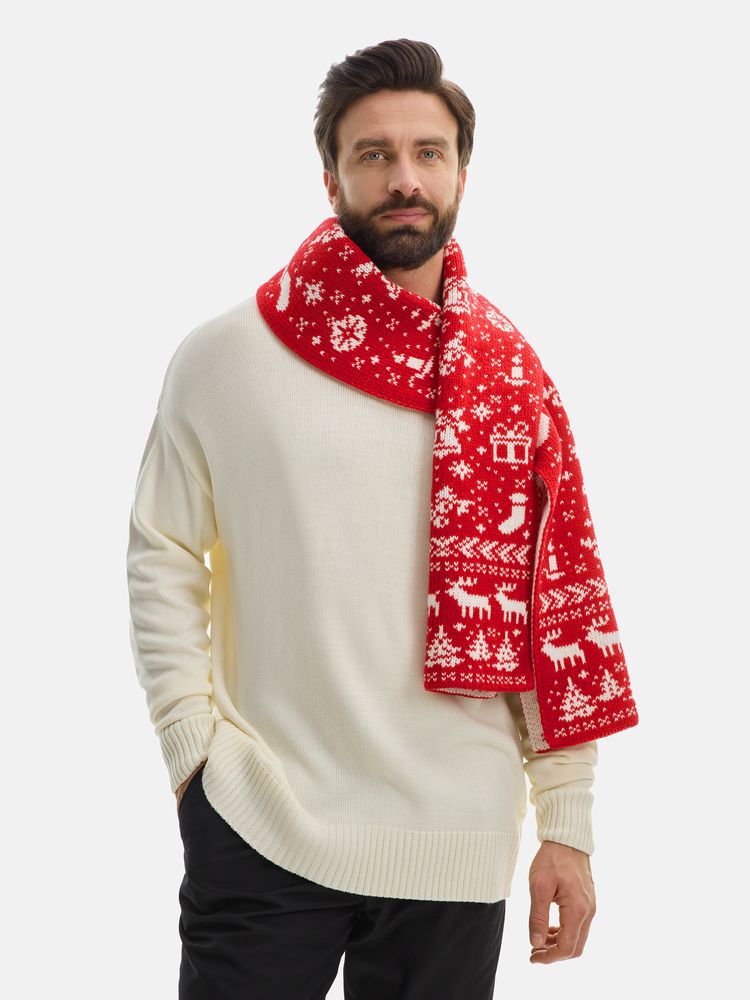 Шарф Holidale выполнен из высокообъемной полушерстяной пряжи, которая дарит тепло и ощущение праздничного уюта. Изысканный жаккардовый узор в традиционных зимних цветах, контрастные сочетания и объемная текстура подчеркивают праздничный характер аксессуара.