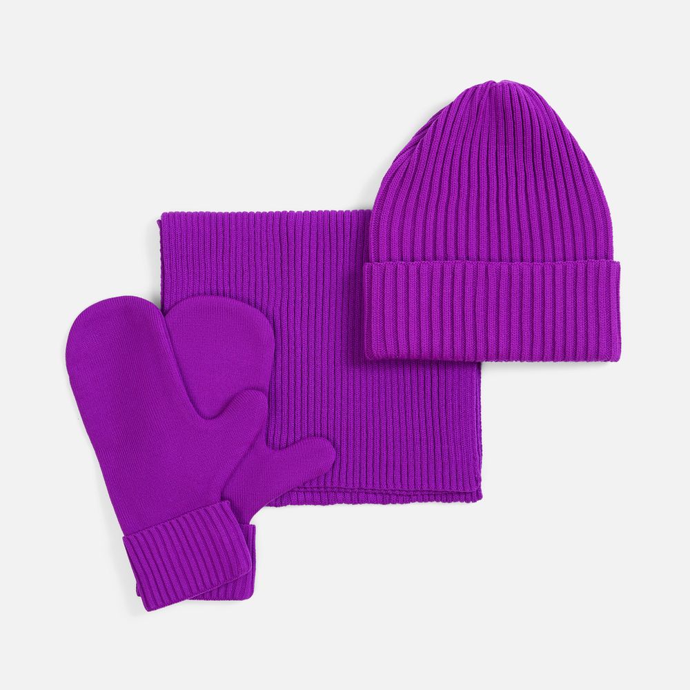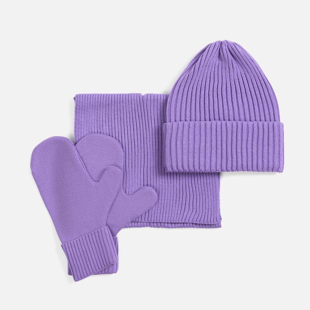 В набор входят удобный шарф с технологичным отверстием для быстрого завязывания, шапка с двойным отворотом и теплые двухслойные варежки с широкой манжетой. Все изделия связаны из акриловой пряжи, отличаются практичностью и элегантной простотой.