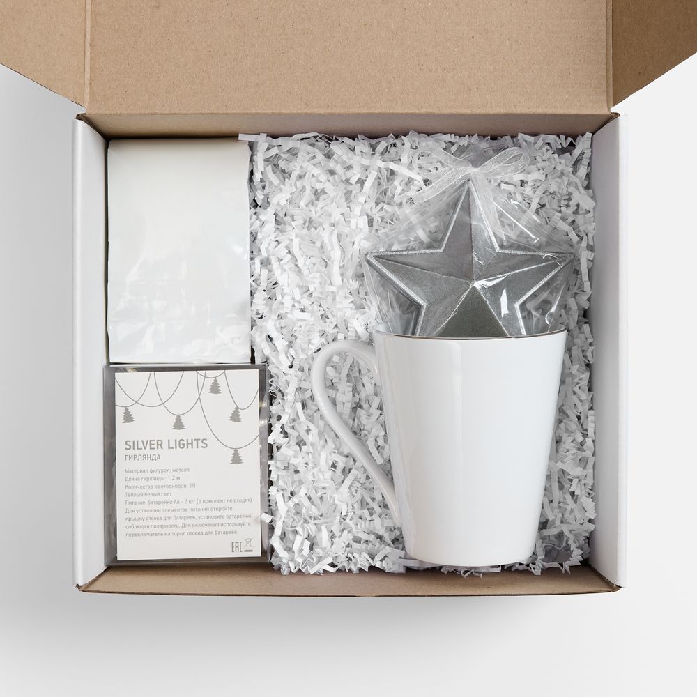 - кружка - костяной фарфор; гирлянда - пластик, металл; свеча - парафин; ежедневник - искусственная кожа; ручка - металл