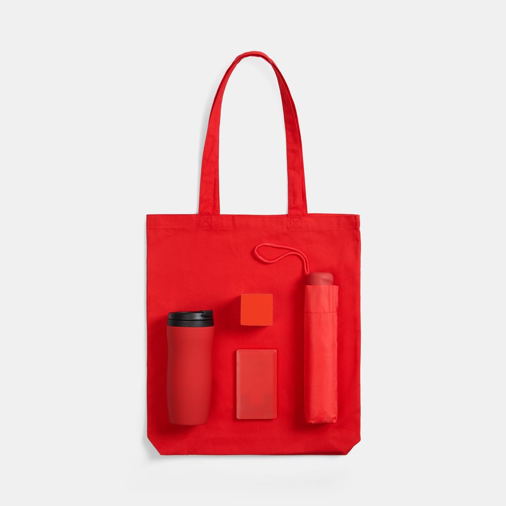 - зонт - полиэстер 190T, ручка - пластик; покрытие софт-тач; каркас, спицы - металл; аккумулятор - пластик; крышка термостакана, внутренняя колба - пластик, корпус - нержавеющая сталь; покрытие софт-тач; сумка - хлопок 100%, плотность 210 г/м²; антистресс - вспененный полиуретан
