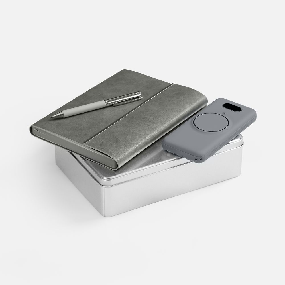 - рюкзак - полиэстер, 600D; чехол подушки - вискоза, 95%, спандекс 5%; наполнитель - вспененный полиуретан; чехол для подушки - полиэстер; термостакан - нержавеющая сталь; крышка - пластик; органайзер, ежедневник - искусственная кожа; покрытие софт-тач; аккумулятор - пластик; покрытие софт-тач