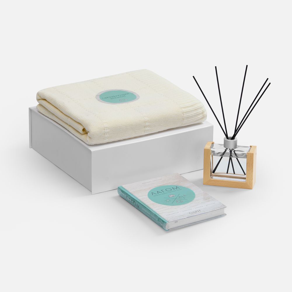 - плед - акрил 100%; коробка - переплетный картон; флакон - стекло; подставка для флакона - дерево, палочки из файбера
