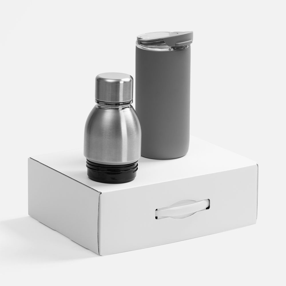 - бутылка - боросиликатное стекло, нержавеющая сталь, бамбук, неопрен; коробка - картон, пластик