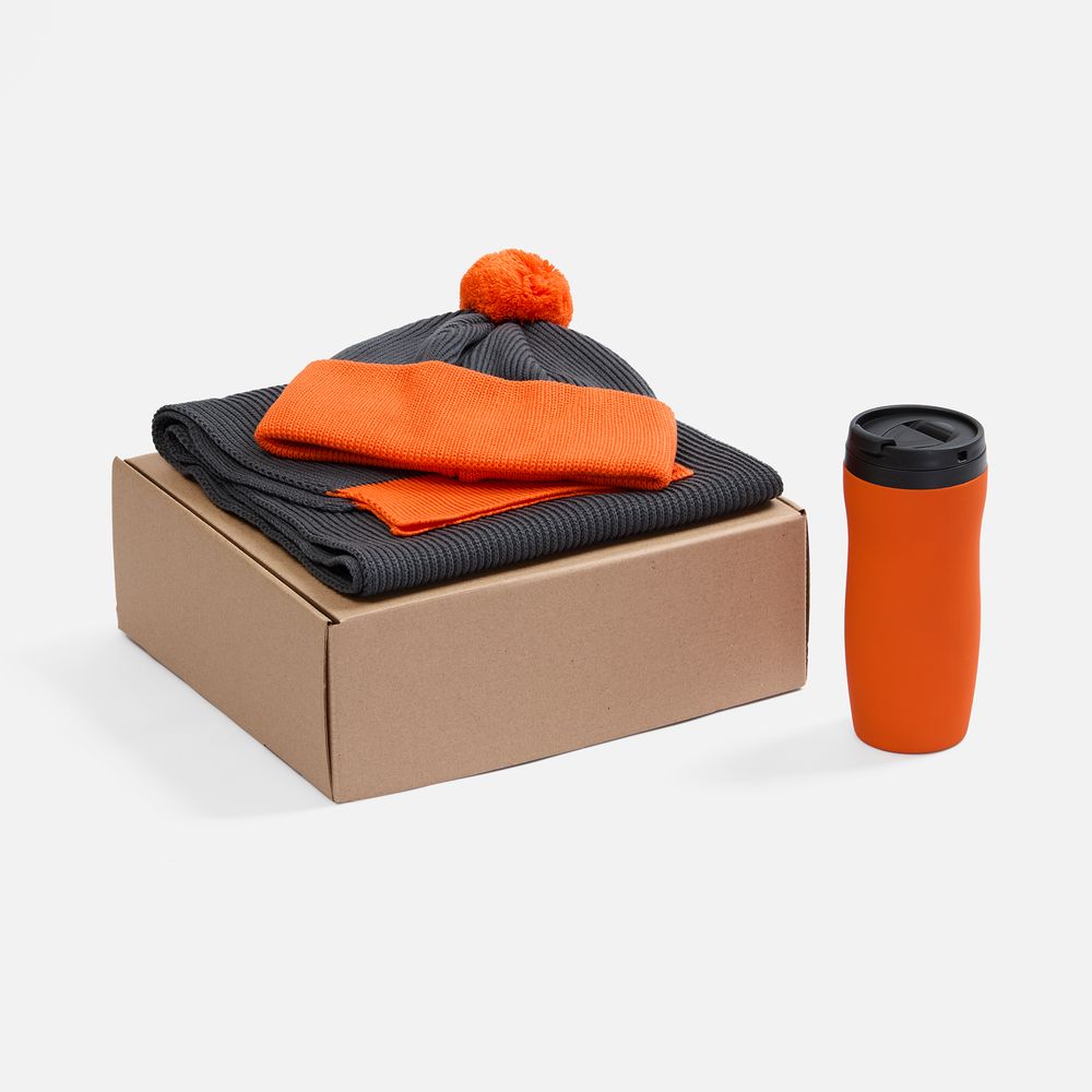 - шарф, шапка - акрил 100%; термостакан - нержавеющая сталь; покрытие софт-тач; крышка, внутренняя колба - пластик; коробка - микрогофрокартон, Т-23Е