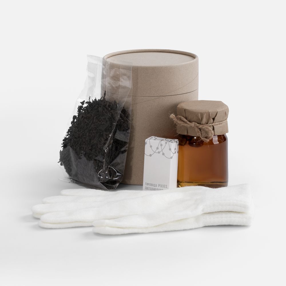 - плед - полиэстер 100%; гирлянда - ПВХ, пластик; карандаш - дерево; скетчбук - искусственная кожа