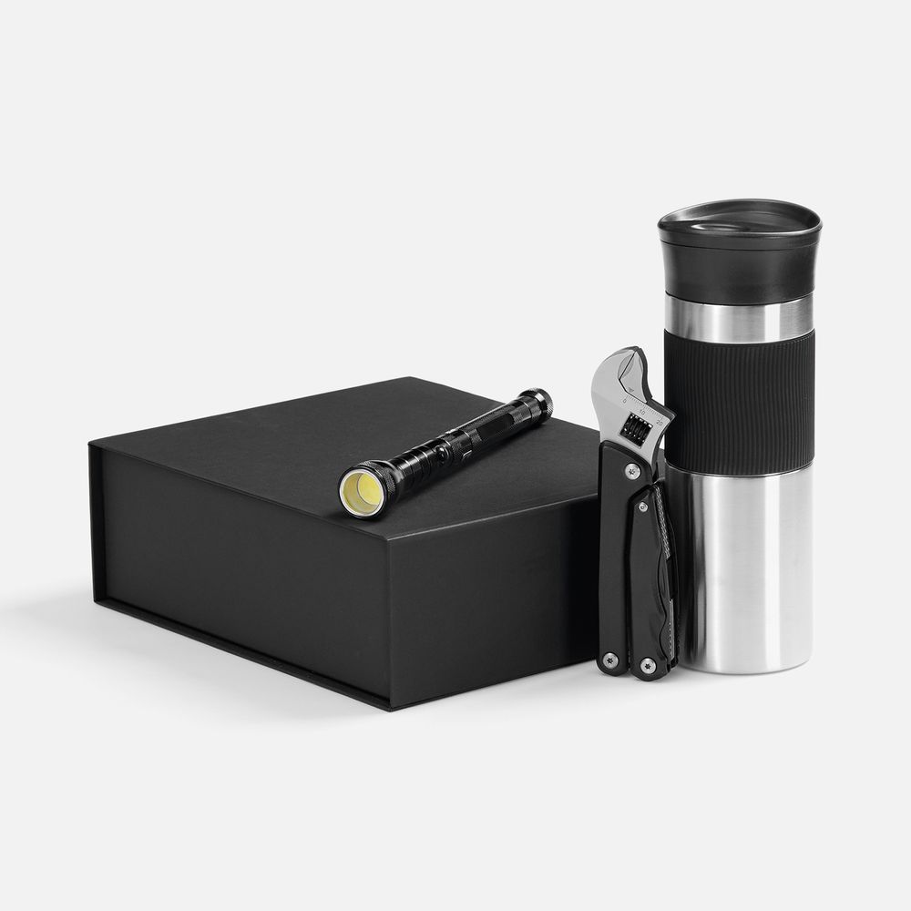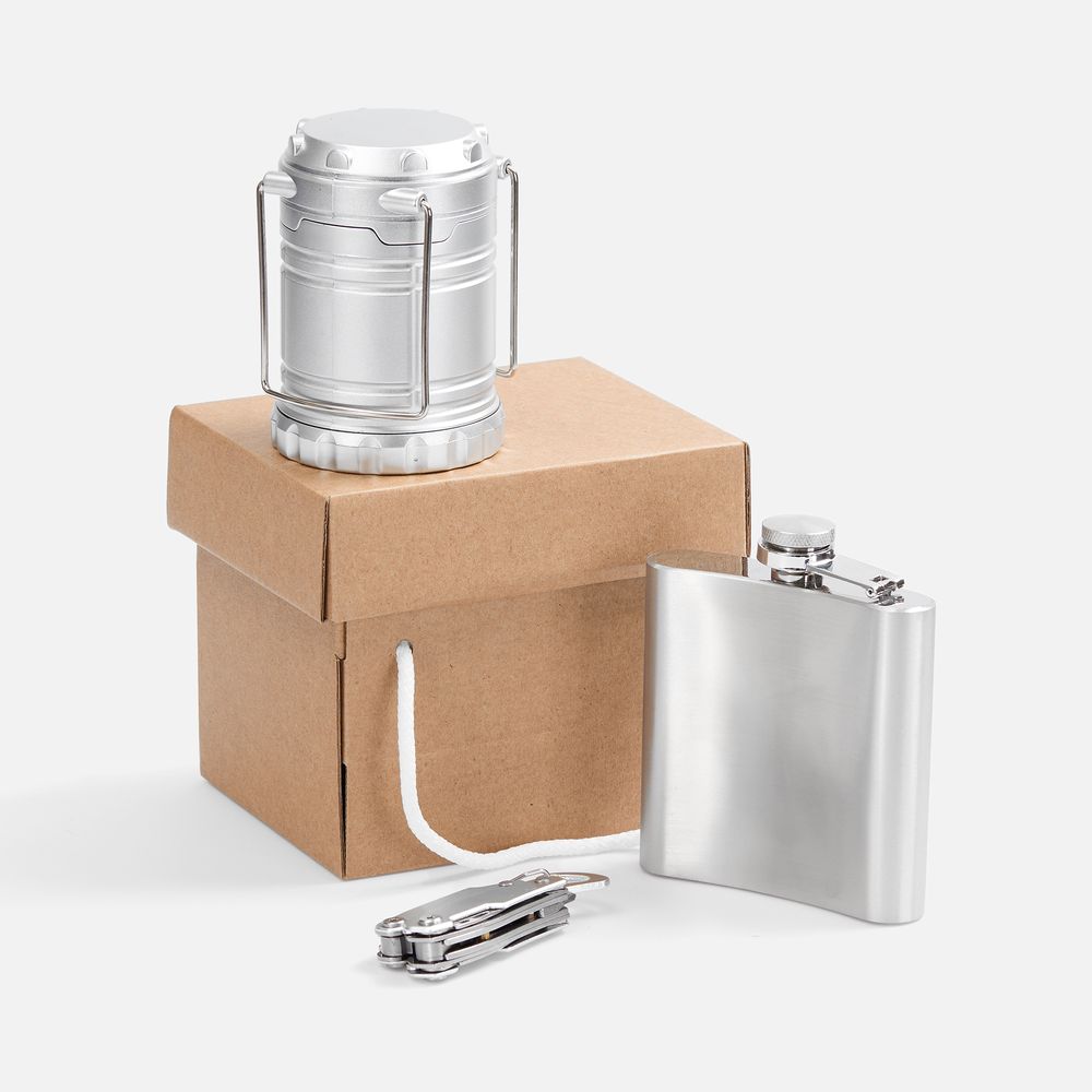 - мультитул - нержавеющая сталь; алюминий; фляжка - нержавеющая сталь, 304; фонарь - АБС-пластик; коробка - микрогофрокартон