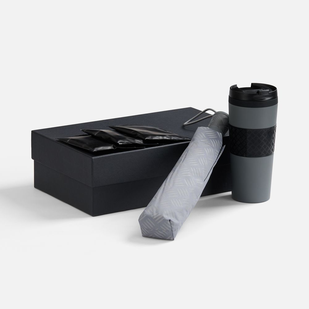 - термостакан - нержавеющая сталь, 304 внутри, 201 снаружи; крышка - пластик; манжета - силикон; зонт - эпонж, 190D; рама - сталь; ручка, топ - пластик; спицы - стеклопластик; упаковка - картон, бумага
