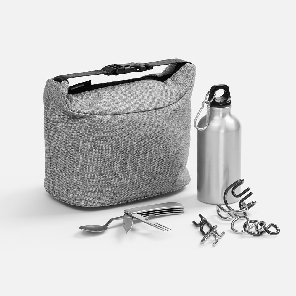 - термосумка - полиэстер, 600D, переработанный; столовый прибор - нержавеющая сталь; бутылка - алюминий; головоломки - металл, нержавеющая сталь; мешочек - хлопок